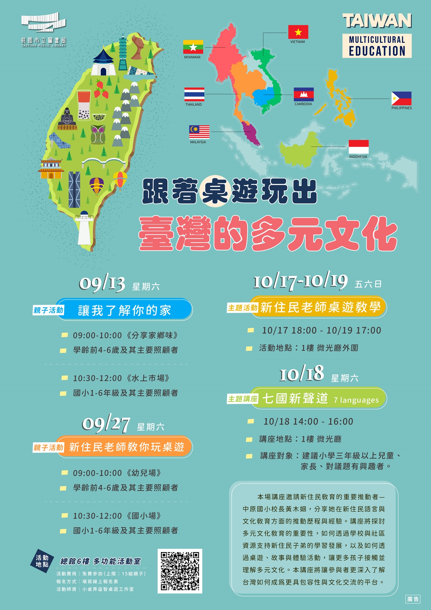 台灣是多元文化的匯聚地,來自不同國家的新住民豐富了我們的語言、飲食與傳統習俗。【 跟著桌遊玩出台灣的多元文化 】9-10 月系列活動透過主題講座、親子桌遊推廣課程與文化體驗攤位,讓大人與孩子在遊戲中學習,感受來自東南亞的文化魅力,並探索台灣如何成為文化交融的美好家園。
