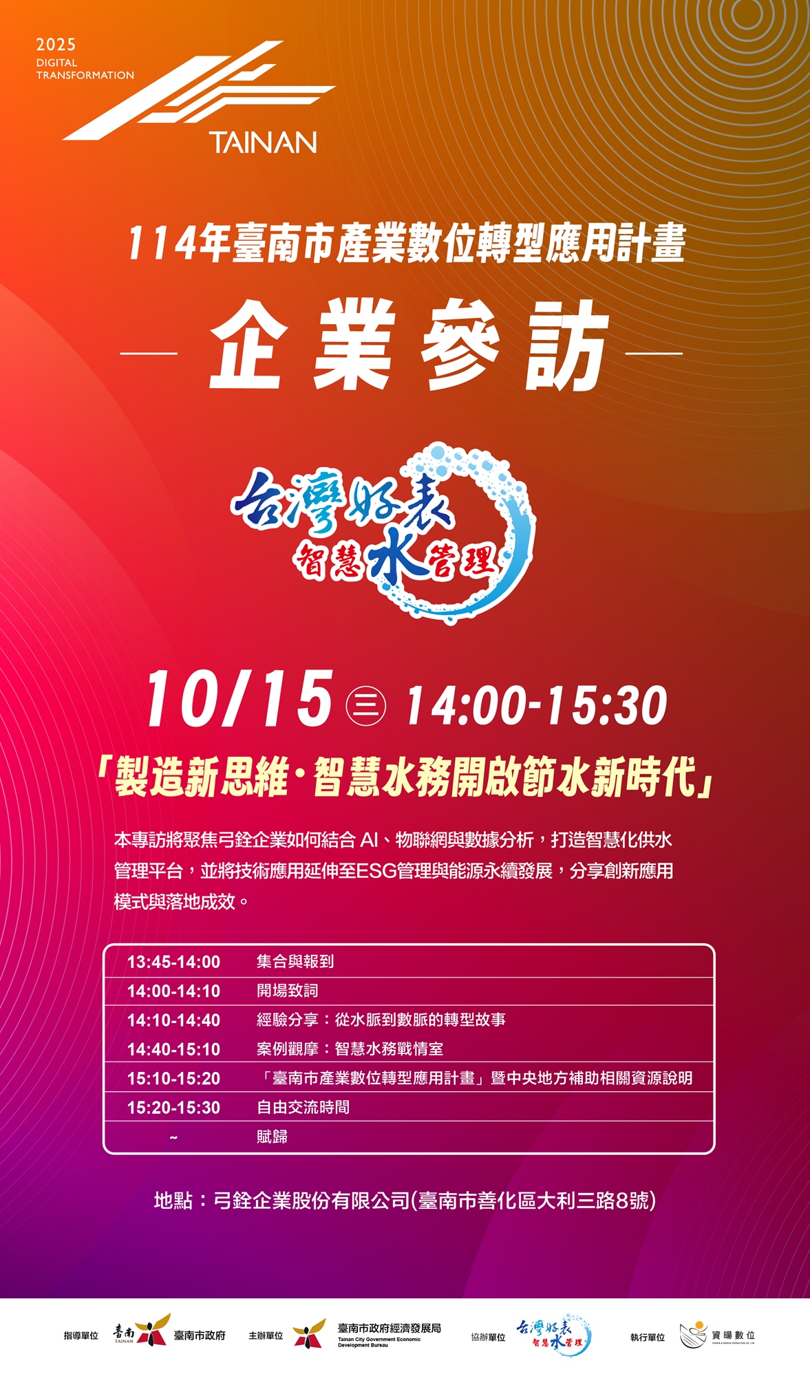 本參訪將聚焦弓銓企業如何結合 AI、物聯網與數據分析,打造智慧化供水管理平台,並將技術應用延伸至ESG管理與能源永續發展,分享創新應用模式與落地成效。