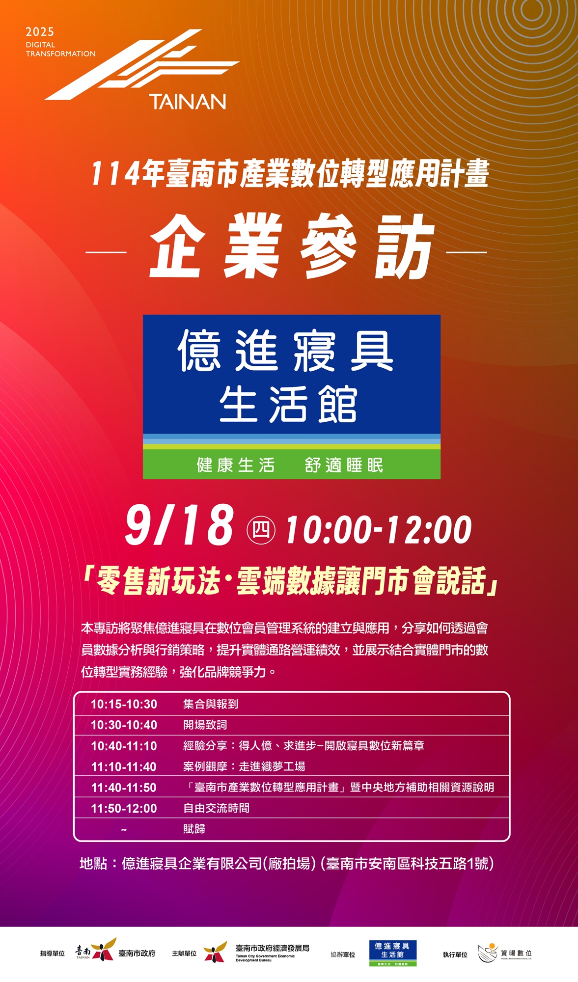 本參訪將聚焦億進寢具在數位會員管理系統的建立與應用,分享如何透過會員數據分析與行銷策略,提升實體通路營運績效,並展示結合實體門市的數位轉型實務經驗,強化品牌競爭力。