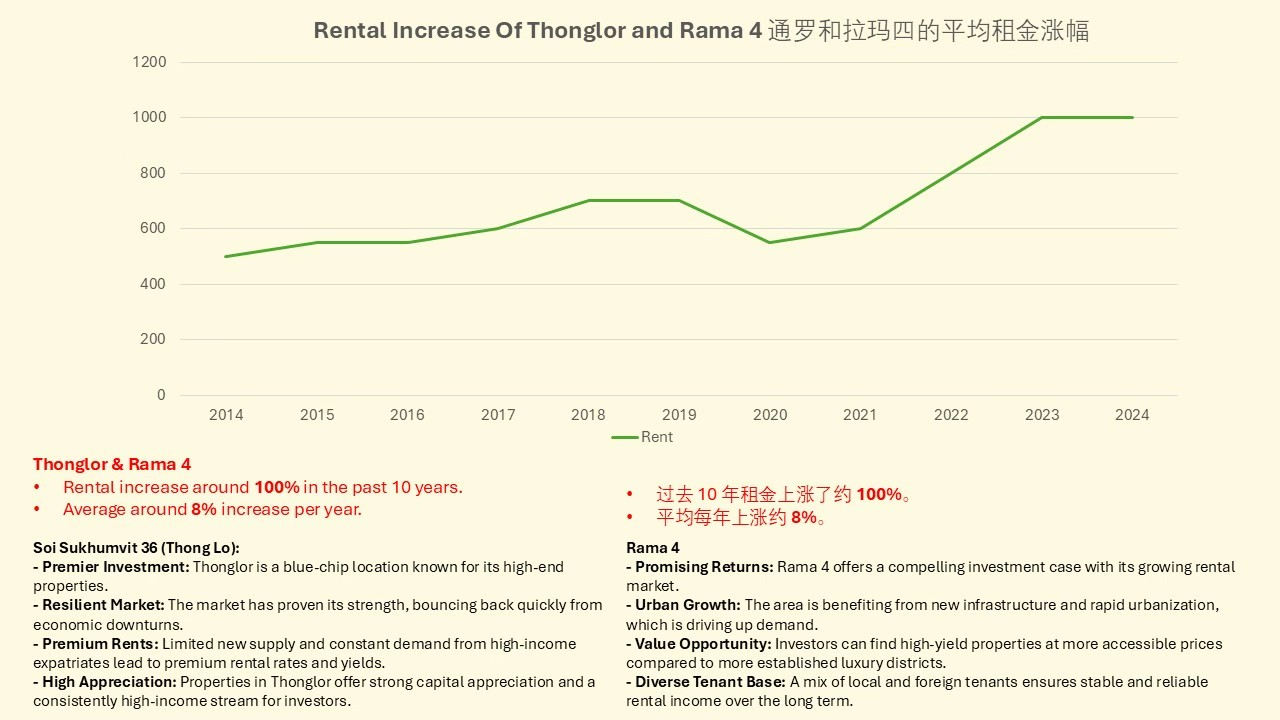 專案位於即可快速通達沙吞CBD、 拉瑪四路多個大型綜合體, 又可享有素坤逸通羅外國人最愛生活圈, 目前一期OKA HAUS出租房源一房難求,租金更是高達800銠每平米每月的高水平, 加上我們359萬銠的租金價格更高是可遇不可求的高租金回報物件。