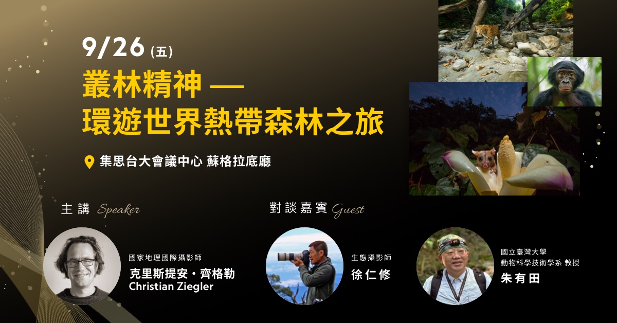 本屆特別邀請 國家地理國際攝影師 克里斯提安‧齊格勒(Christian Ziegler)來臺發表專題演講〈叢林精神-環遊世界熱帶森林之旅〉。Ziegler 長年專注熱帶雨林與生物多樣性攝影,足跡遍及中南美洲、非洲及亞洲,以鏡頭呼籲全球關注自然保育。