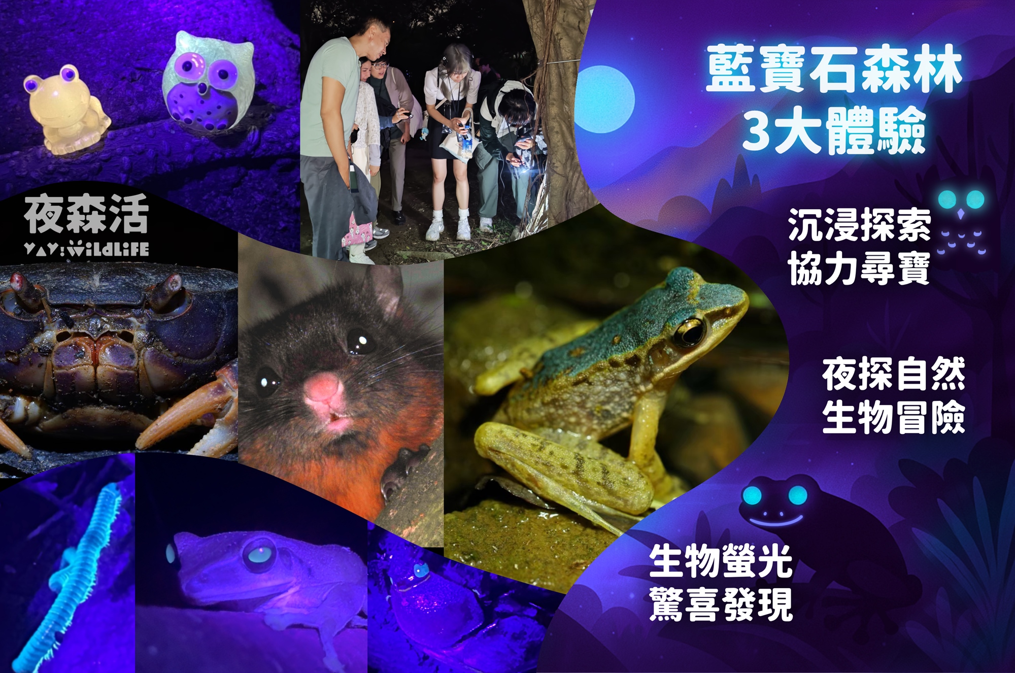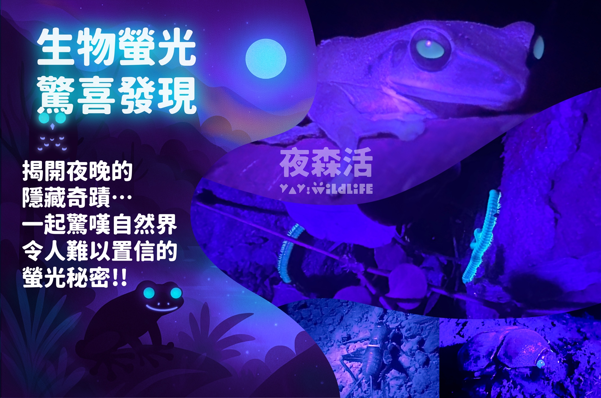在專業講師的帶領下,看見肉眼難辨的自然奇蹟!揭開青蛙、甲蟲、蕨類、夜行動物們在夜晚的神秘微光,驚艷於大自然的奧秘,揭開平時看不見的驚喜!