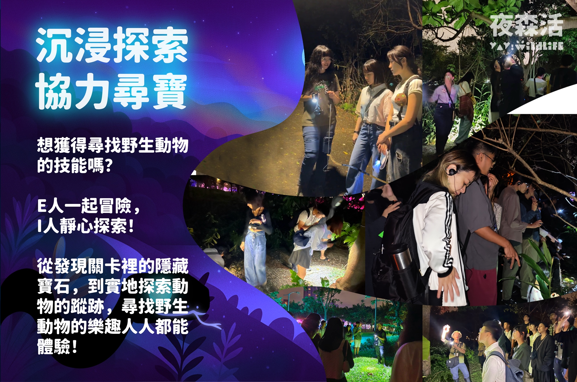 在陽明山天母古道,一起走進夜間森林,展開一場結合生態探索、黑夜尋寶、生物螢光的沉浸式冒險體驗!在專業導覽帶領下,用五感認識自然,留下專屬陽明山森林的難忘回憶!