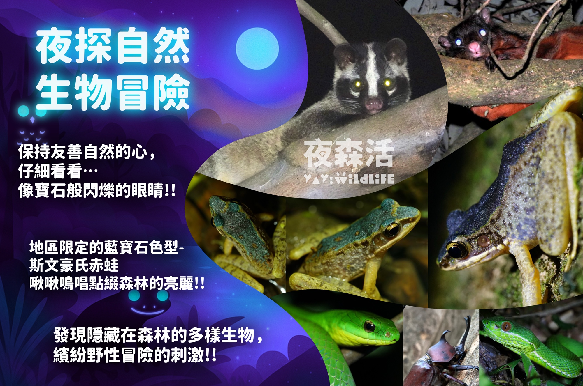活動時間18:00-20:30,費用包含:旅平險、專業手電筒借用、深度自然體驗&野生動物觀察互動、活動精彩紀錄