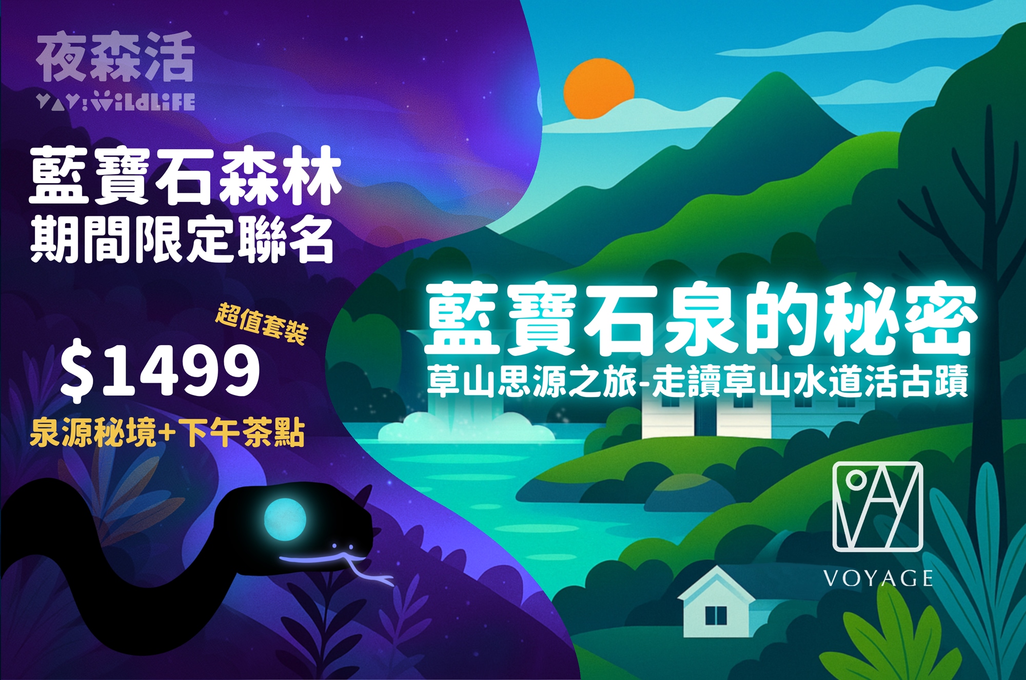 我們本次與 陽明山在地導覽團隊 Voyage陽明山 攜手合作,結合日間活動【藍寶石泉的秘密_草山思源之旅-走讀草山水道活古蹟】,推出首次從日到夜的藍寶石森林活動,今年7-9月在天母古道限時推出。