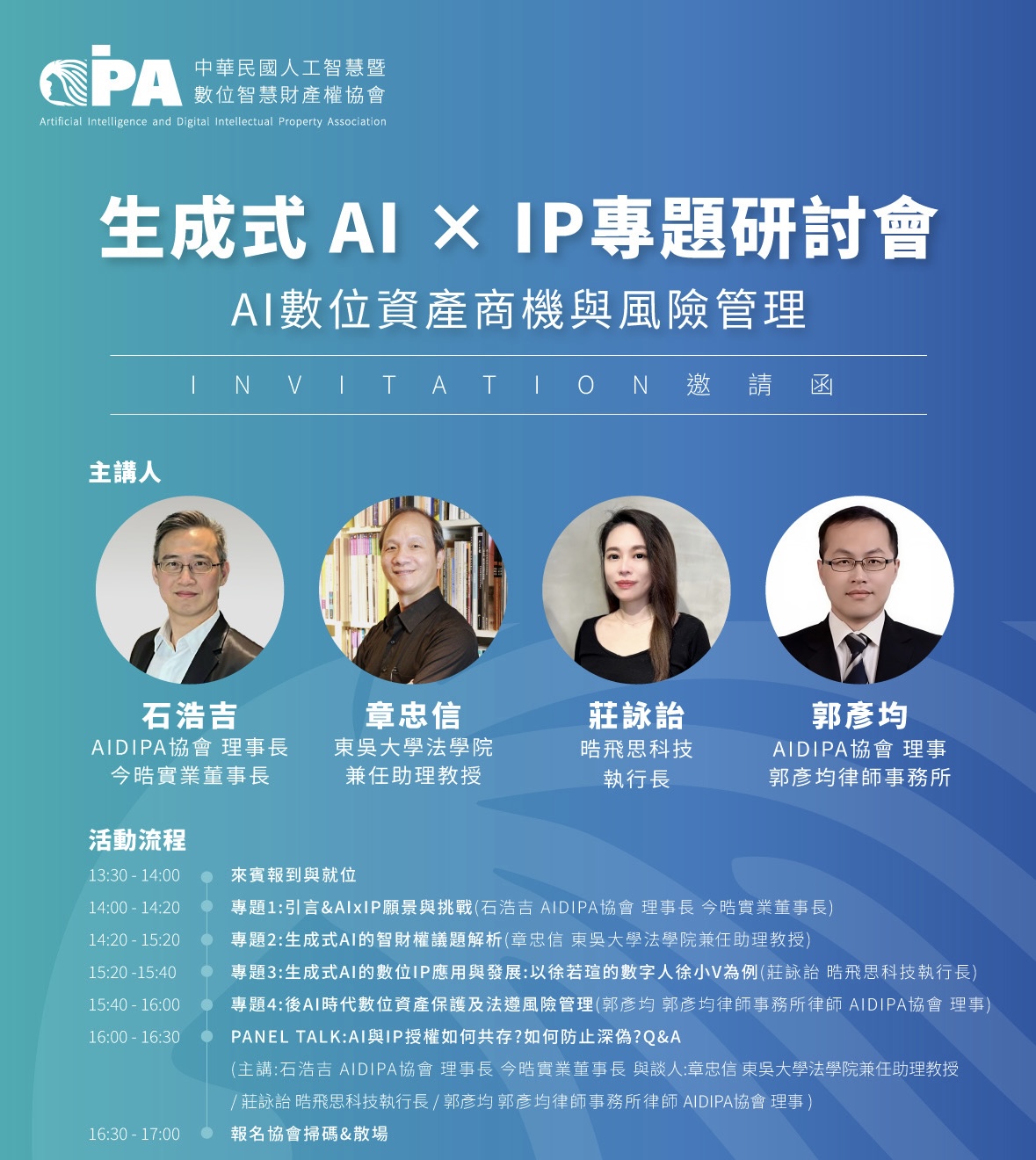 本研討會由 中華民國人工智慧暨數位智慧財產權協會(AIDIPA) 主辦,將邀集產官學界代表與業界專家,共同探討生成式 AI 在圖像、角色、聲音、文案等多元 IP 領域的應用發展,以及數位資產在新時代下的法律與管理議題。活動內容包含專題演講與實務案例分享,並設有 Panel Talk 與互動 Q&A,協助參與者掌握趨勢、降低風險、拓展新商機。