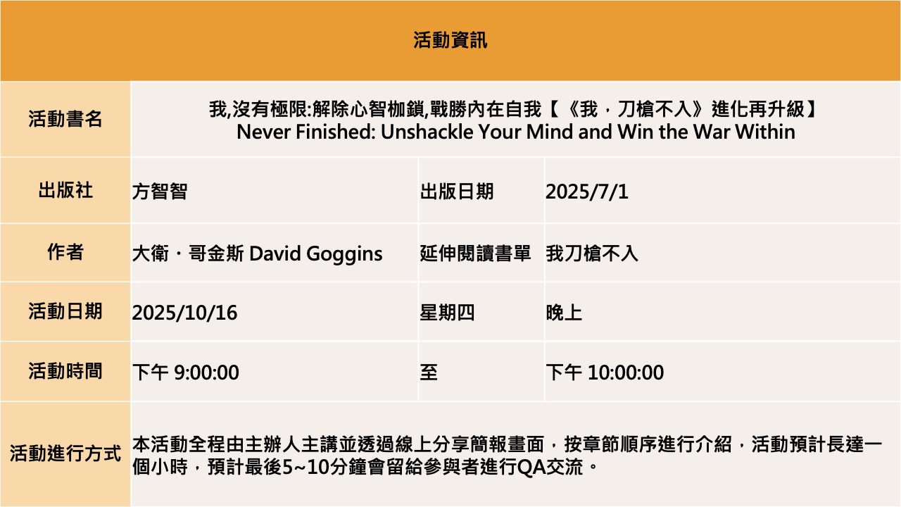 【BookBook預約線上讀書會】我,沒有極限:解除心智枷鎖,戰勝內在自我