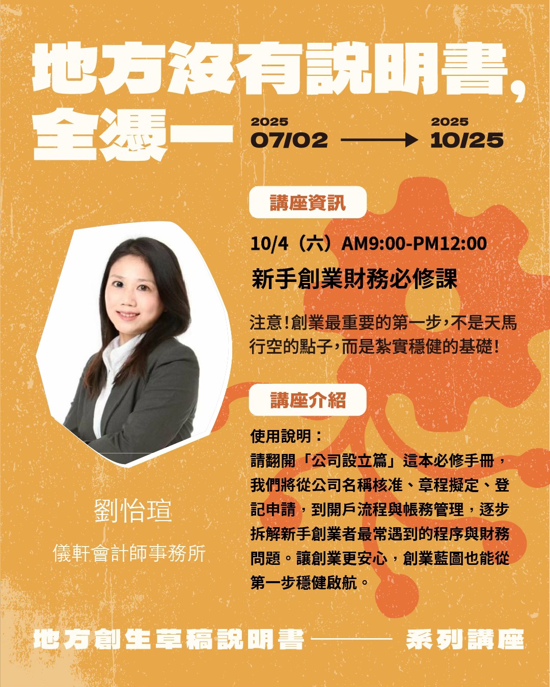 從公司名稱核准、章程擬定、登記申請,到開戶流程與帳務管理,創業每一步都有關鍵細節!這場【公司設立篇】講座,將帶你釐清公司設立程序、掌握財務規劃技巧,避免踩雷,讓你的創業藍圖從第一步就穩健啟航。
