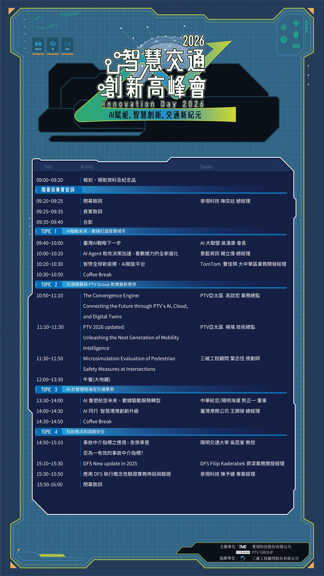 未來的交通產業不僅關乎解決行的需求,更是關乎數位化技術的應用。這場盛會為您邀請到專業交通軟體公司PTV Group、交通圖資數據服務公司TomTom、交通影像辨識DataFromSky等貴賓一同參與分享,將助您透過數據應用來透視未來交通產業趨勢,並找到脫穎而出的策略與商機。