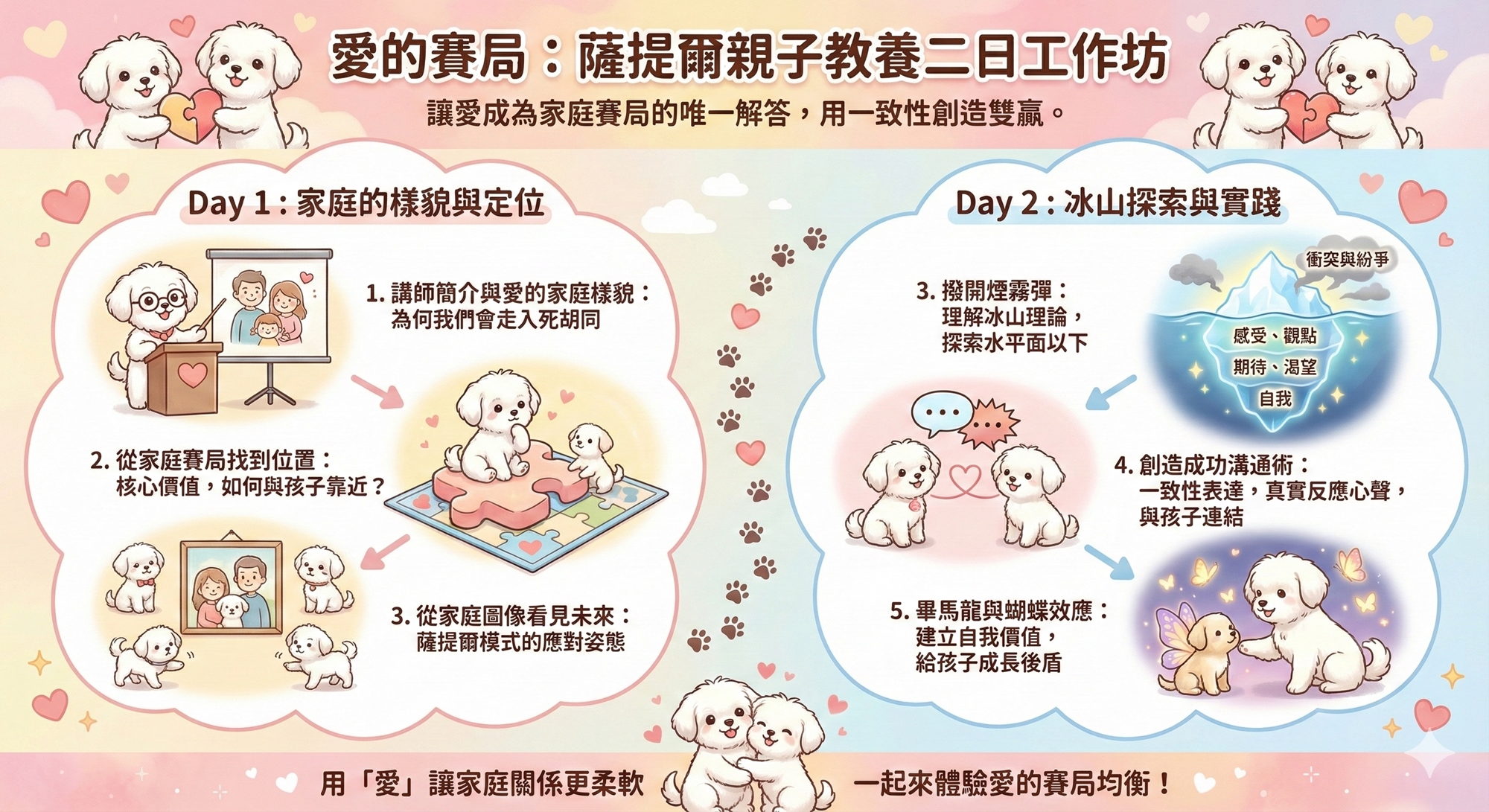 儀婷老師是薩提爾模式的帶領者也是實踐者,從原生家庭到自組家庭,都能運用薩提爾模式得宜。透過體驗,儀婷老師帶領學員將渴望中的資源導入,以正向與一致性投入家庭關係與親子教養,達到「愛的賽局」均衡。