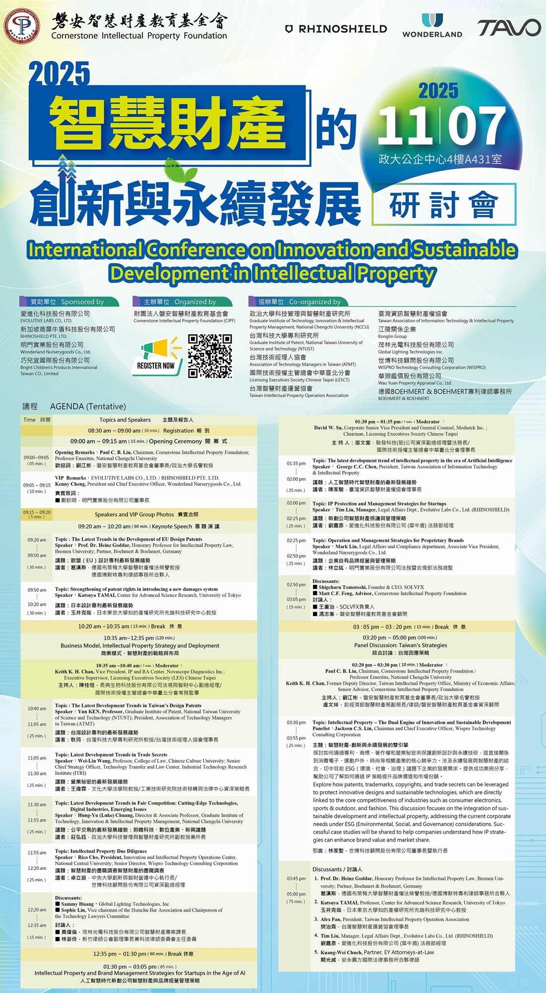 掌握智慧財產的創新與永續發展,歐洲、日本及台灣頂尖專家學者,解析國際最新智慧財產的創新與永續發展趨勢及勝出的解方,是您絕對不容錯過的國際研討會!