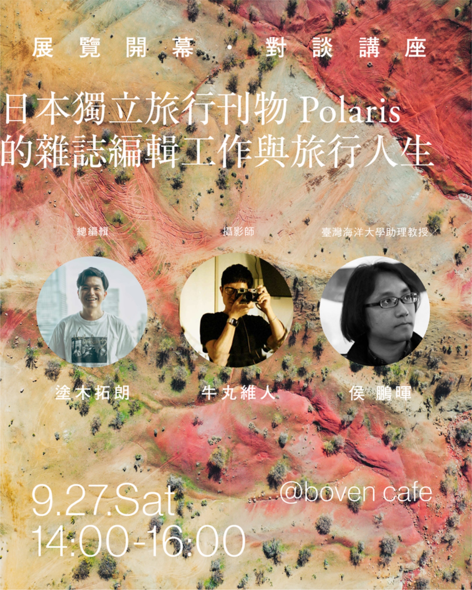 日本獨立旅行雜誌《Polaris》的總編輯 塗木拓朗(Takuro Nuruki)、攝影師牛丸維人(Masato Ushimaru),以及 Polaris的團隊,將與大家分享有關雜誌製作的經驗與旅行的魅力。