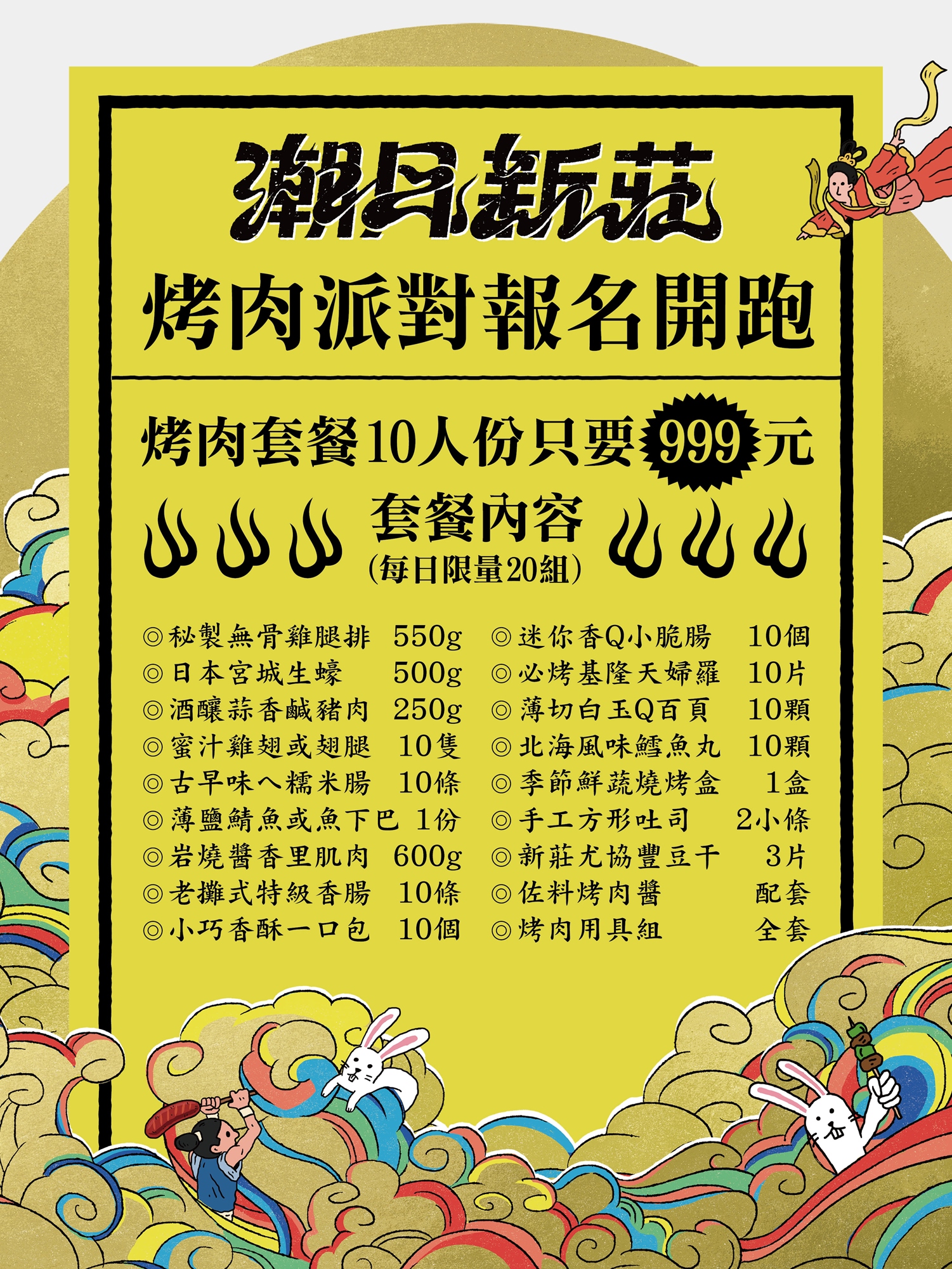 活動內容 新北市政府首度舉辦「潮月新莊」系列活動,結合中秋節慶、廟街文化與特色市集,帶來文化、美食、音樂多重體驗!最受期待的「中秋烤肉派對」封街登場,提供烤肉設備與10人份食材,還有在地尤協豐豆干相伴。活動兩日每日限量20組報名,熱鬧歡樂不容錯過,快揪好友一起線上報名,共享團圓美好時光!