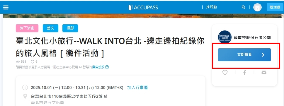 - 參加者將短影音上傳至個人社群平臺(Yt、Fb、Ig、Threads等)頻道獲得連結並Hashtag臺北文化小旅行。