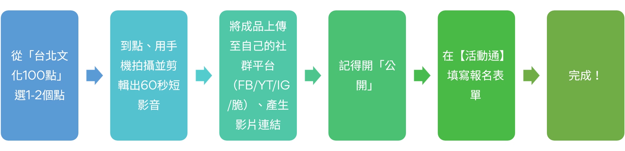 - 投稿內容:需有影片標題及文字說明(請含#臺北文化小旅行;文字100字內),影片內容須包含1-2處「臺北文化小旅行100處文化點」。
