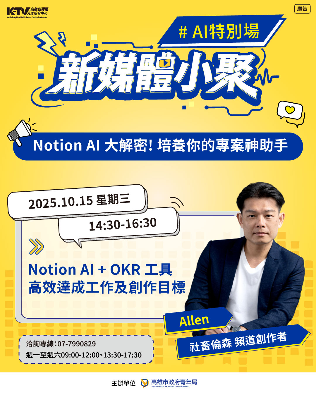 ▸ 地點:K-TV高雄新媒體人才培育中心(高雄市鳳山區光復路二段132號前棟2樓)