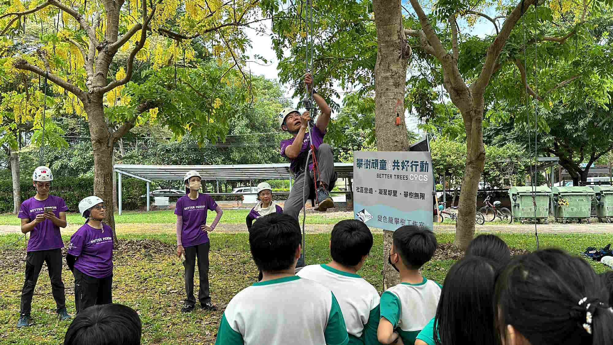 此活動邀請到2023年「銀福獎」計畫 活到老,攀到老|長者攀樹 的提案人黃銘通大哥帶領計畫培育出平均年紀70幾歲的丙級攀樹教練"攀樹頑童"們來帶領大家從不一樣的視野攀樹。
