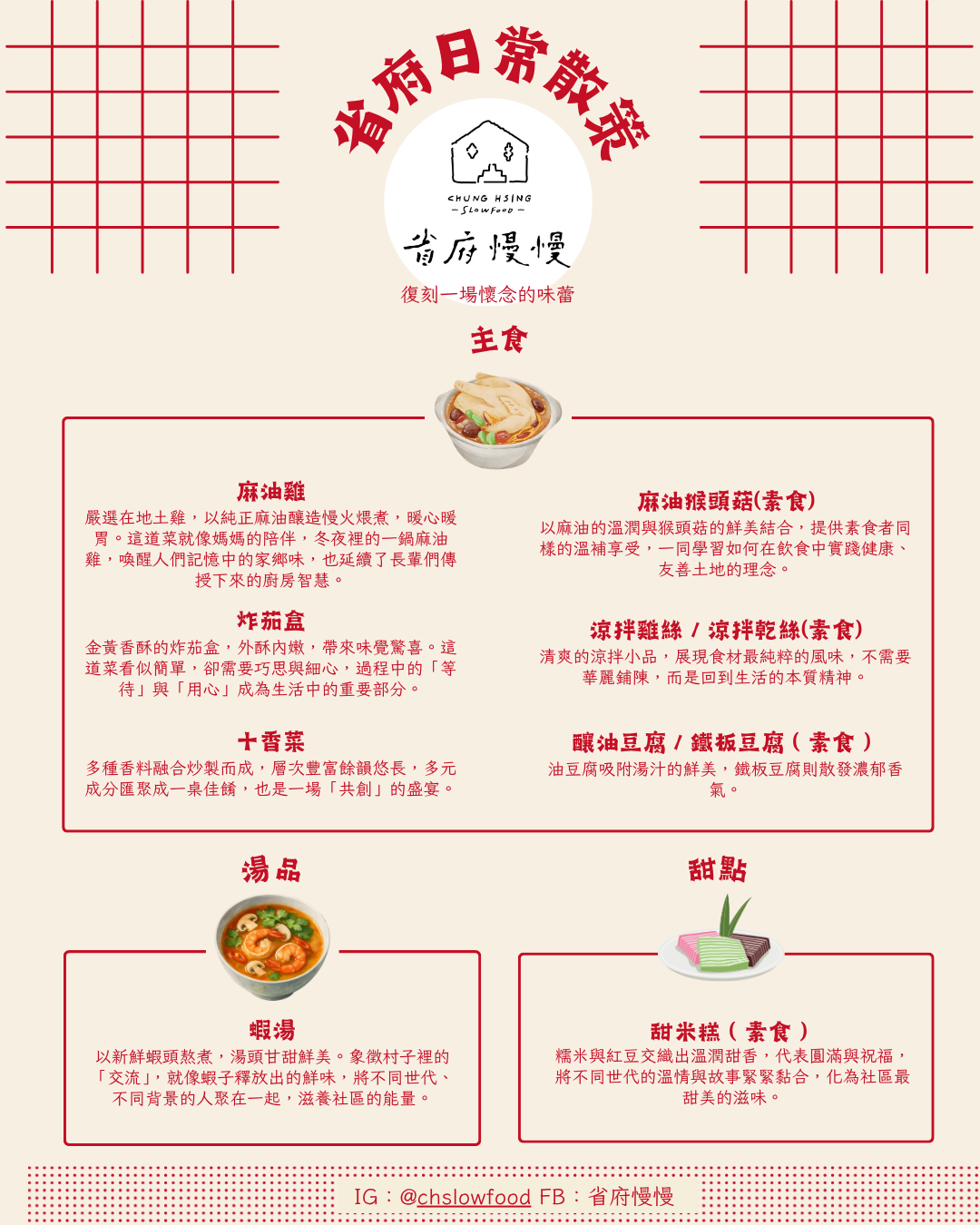 此活動邀請了2024年「新生活獎」計畫 青銀共創記憶復刻餐桌傳承計畫 長期駐地的省府日常散策從計畫裡精選產出的復刻美食菜單提供午餐饗宴與大家分享。