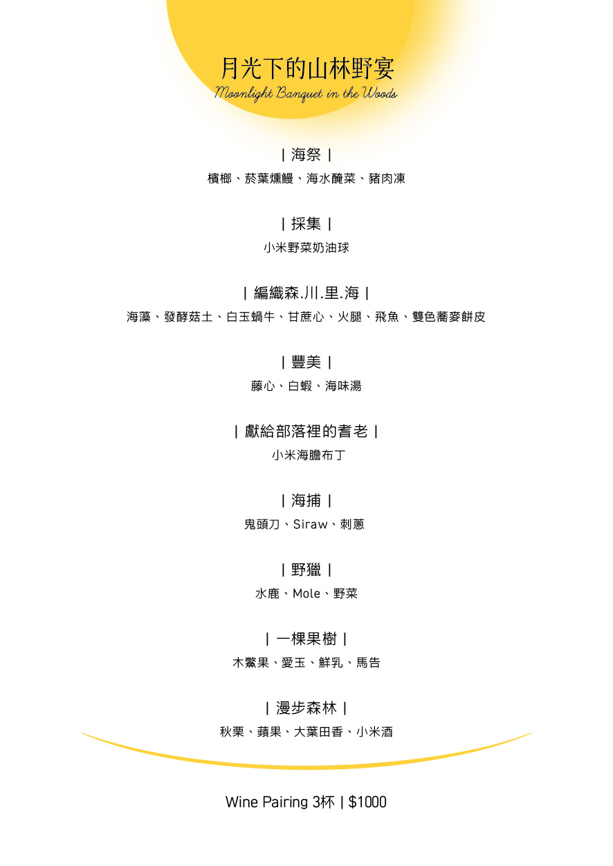 從阿美族的海祭開場,然後從海到山,以小米與野菜凝聚採集的純粹,藤心、白蝦、鬼頭刀與獸肉,展現山海的豐美與狩獵的厚實,也編織起森川里海的交錯風景。每一道菜,都是一個片段,串起屬於台東的秋境。