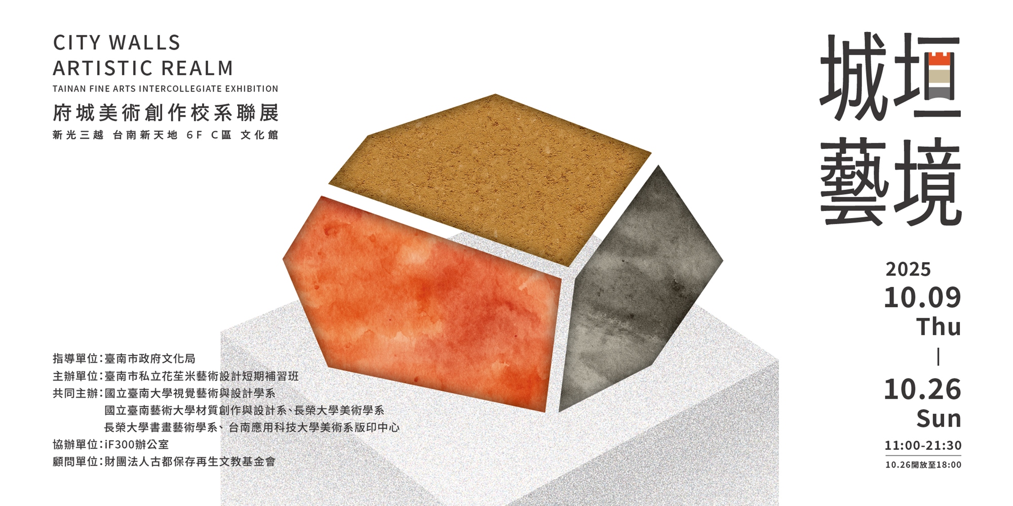 首創邀集台南五所美術創作校系共同參與,匯聚平面繪畫、立體裝置、複合媒材設計等多元創作形式。適逢府城建城三百年,以藝術視角重新認識台南的文化與故事。