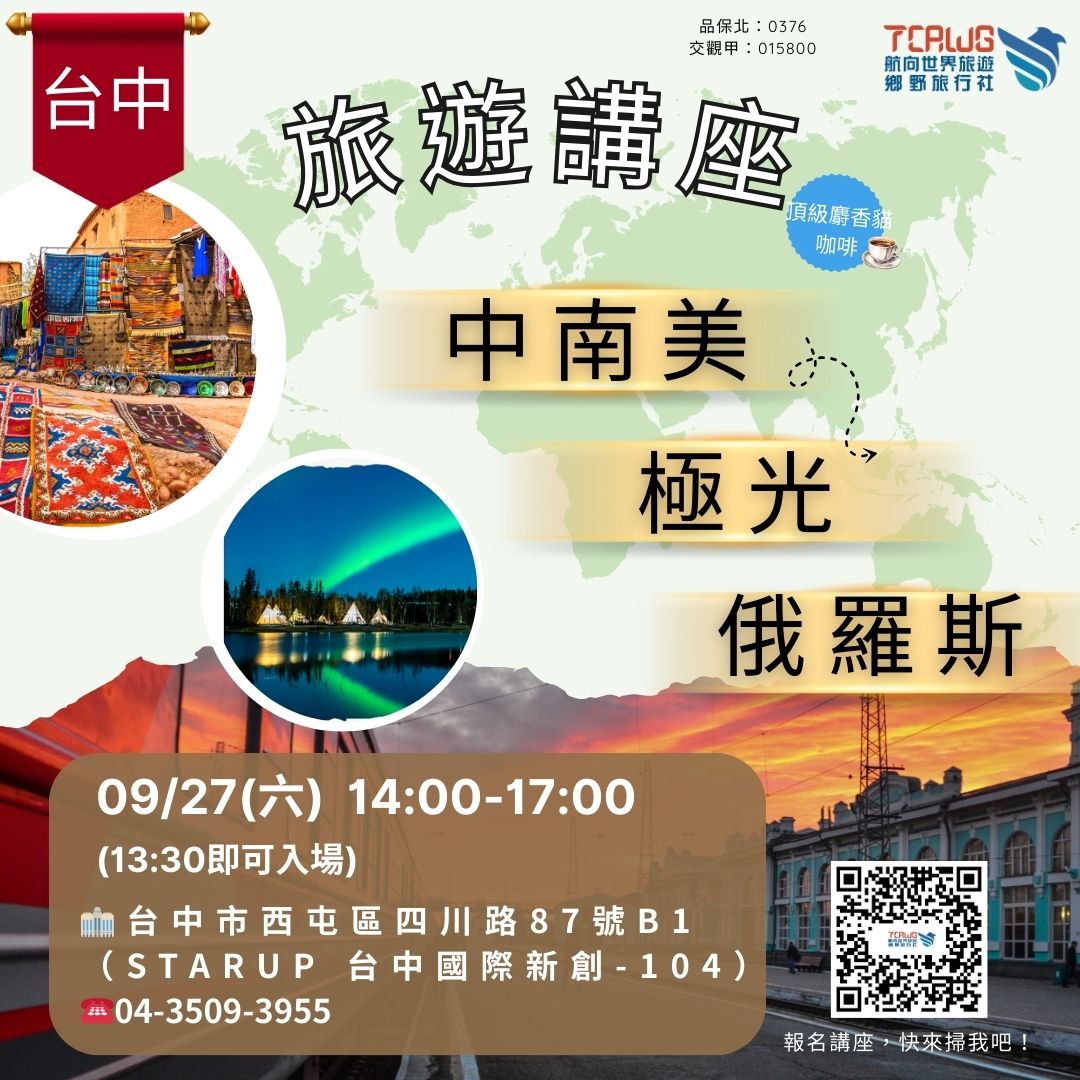 📅 9/27(六)台中講座|極光奇旅 × 俄羅斯秘境 × 中南美魅力