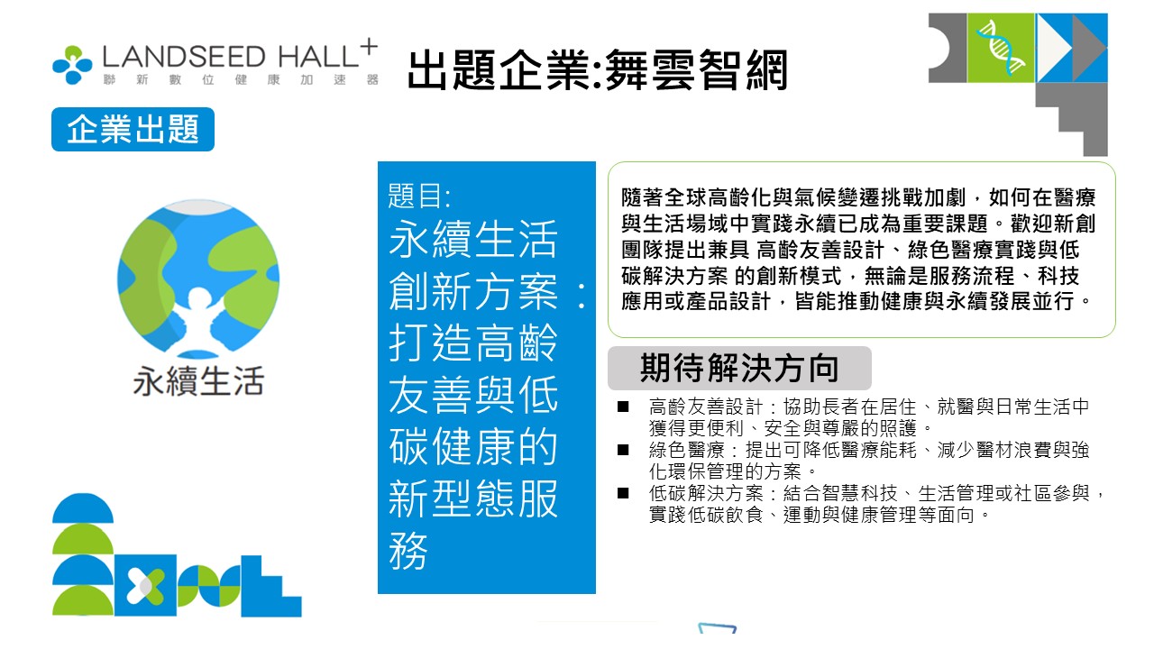 - 永續生活(高齡友善、綠色醫療、低碳健康解決方案)