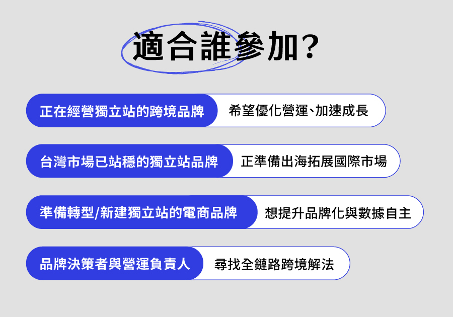 這場活動集結來自 Shopify、AstralWeb、Global-e、Return Helper 的專家講者,帶來第一手實戰經驗分享,並以台灣品牌角度切入,深入解析如何規劃 全鏈路跨境成長策略。