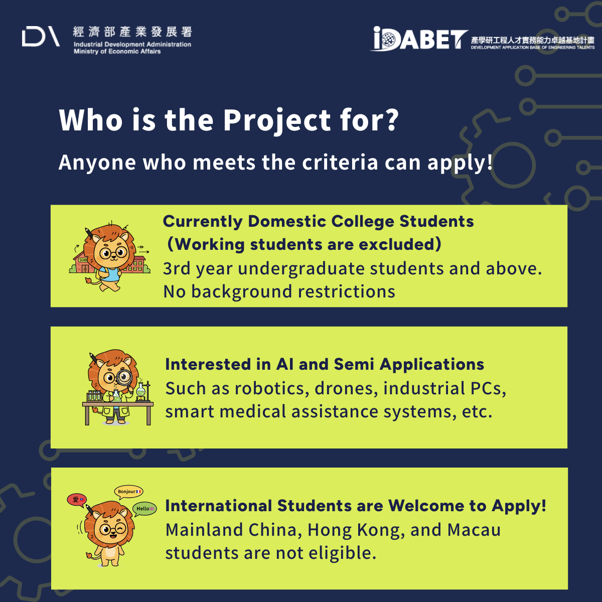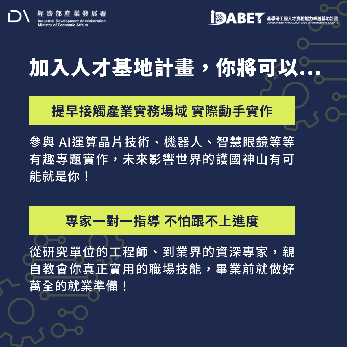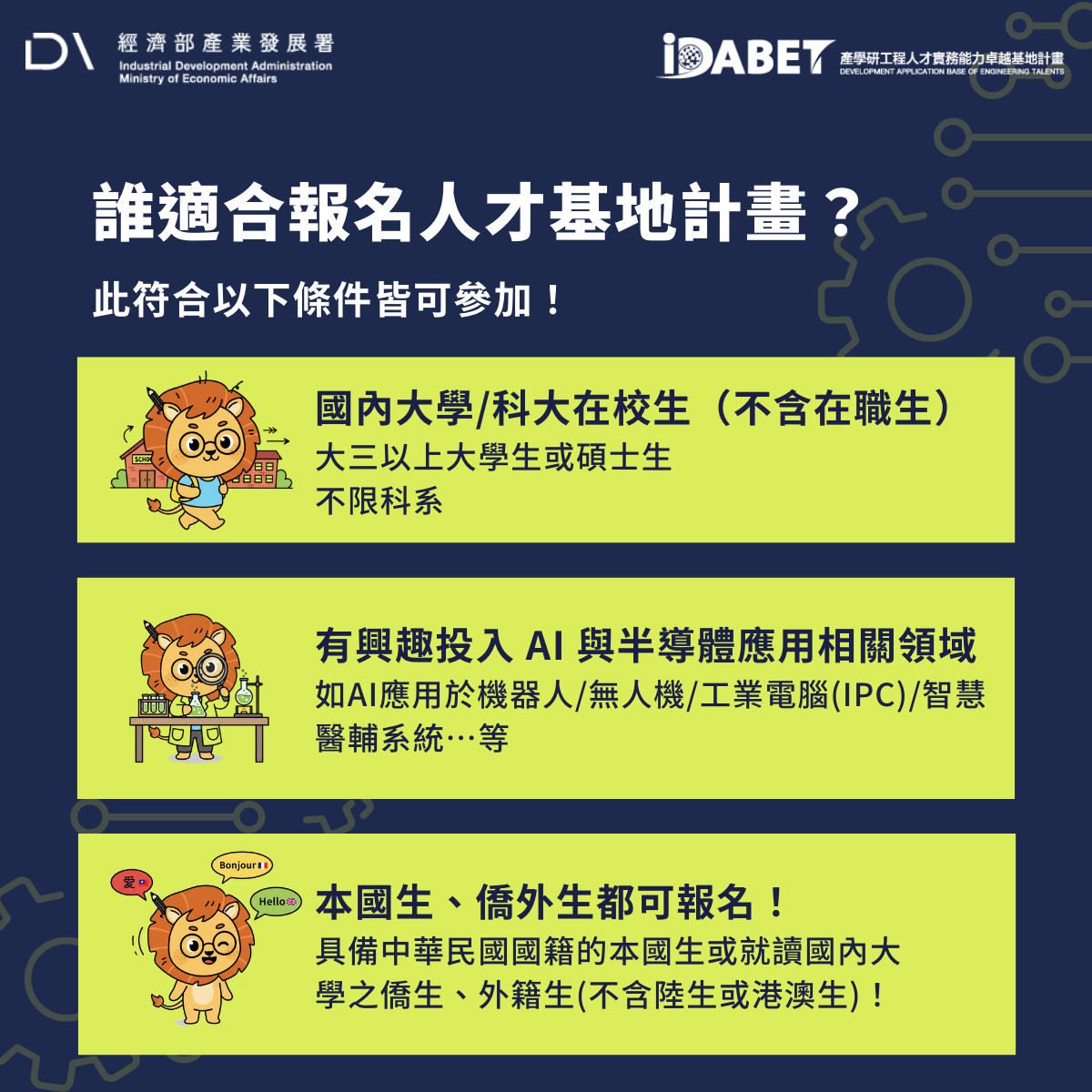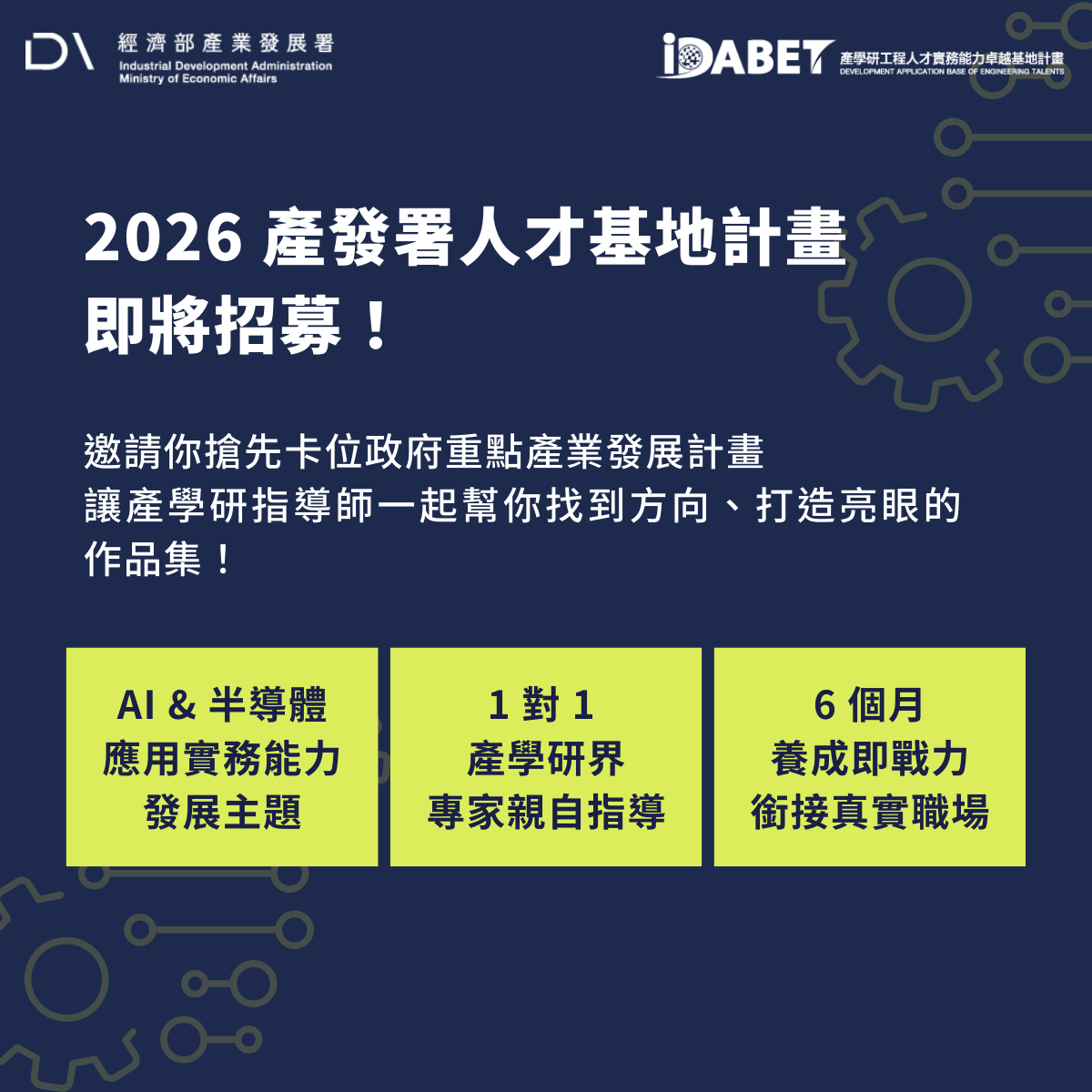 1. This event is organized by the Industrial Development Administration, Ministry of Economic Affairs, as part of the "2026 Development Application Base of Engineering Talents (iDABET) Project." Personal data will be collected, processed, and used for the purposes of this project. In accordance with Article 8, Paragraph 2, Subparagraph 2 of the Personal Data Protection Act, the obligation to inform the data subject may be exempted.