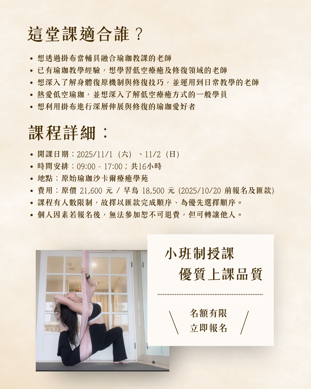 🔹因名額有限,完成報名後,請務必加入官方Line: @originalyoga( https://lin.ee/qCJPENu )與學苑聯絡,並告知報名姓名與電話,由學苑通過審核後,並完成付款程序,才算報名成功!