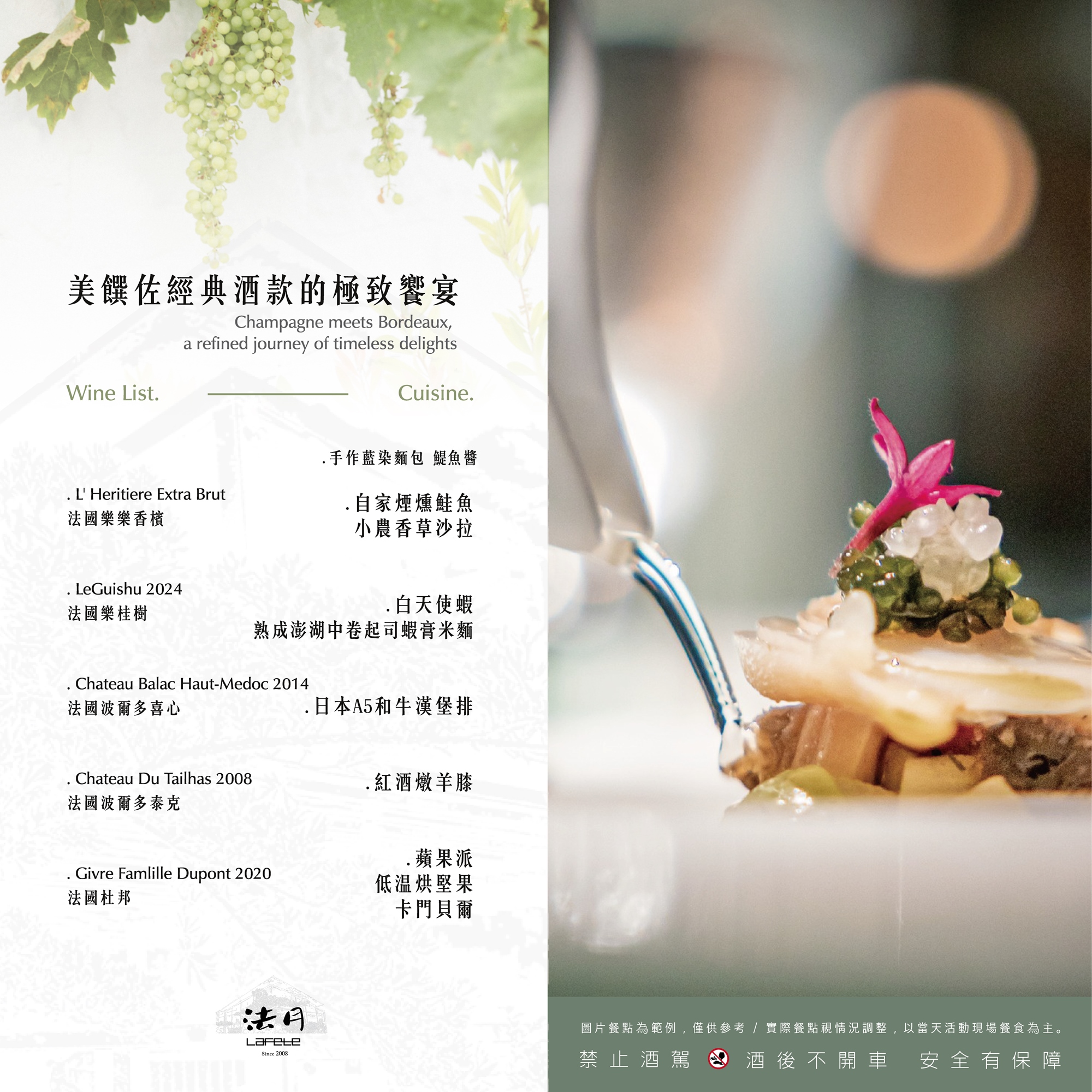 來自法國的經典佳釀,從香檳的細緻氣泡、波爾多紅酒的陳年風華,到冰酒的甜美馥郁,帶領我們走進一場優雅而難忘的法式品酒盛會。