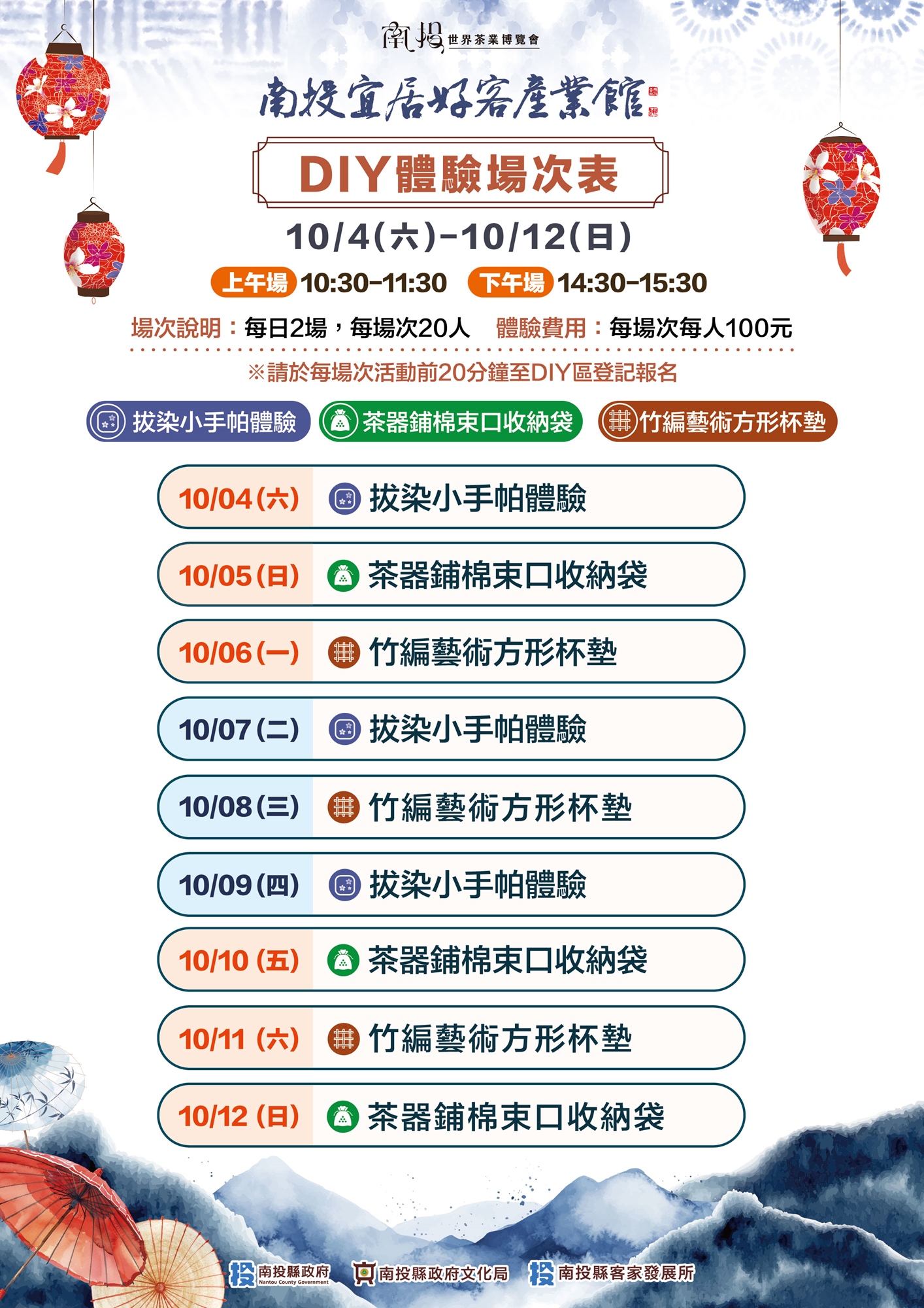 - 敬請記得活動報名時間,於該場次開始前20分鐘至「南投宜居好客產業館 DIY體驗區報到」,並於現場出示活動報名QRcode以利工作人員確認。