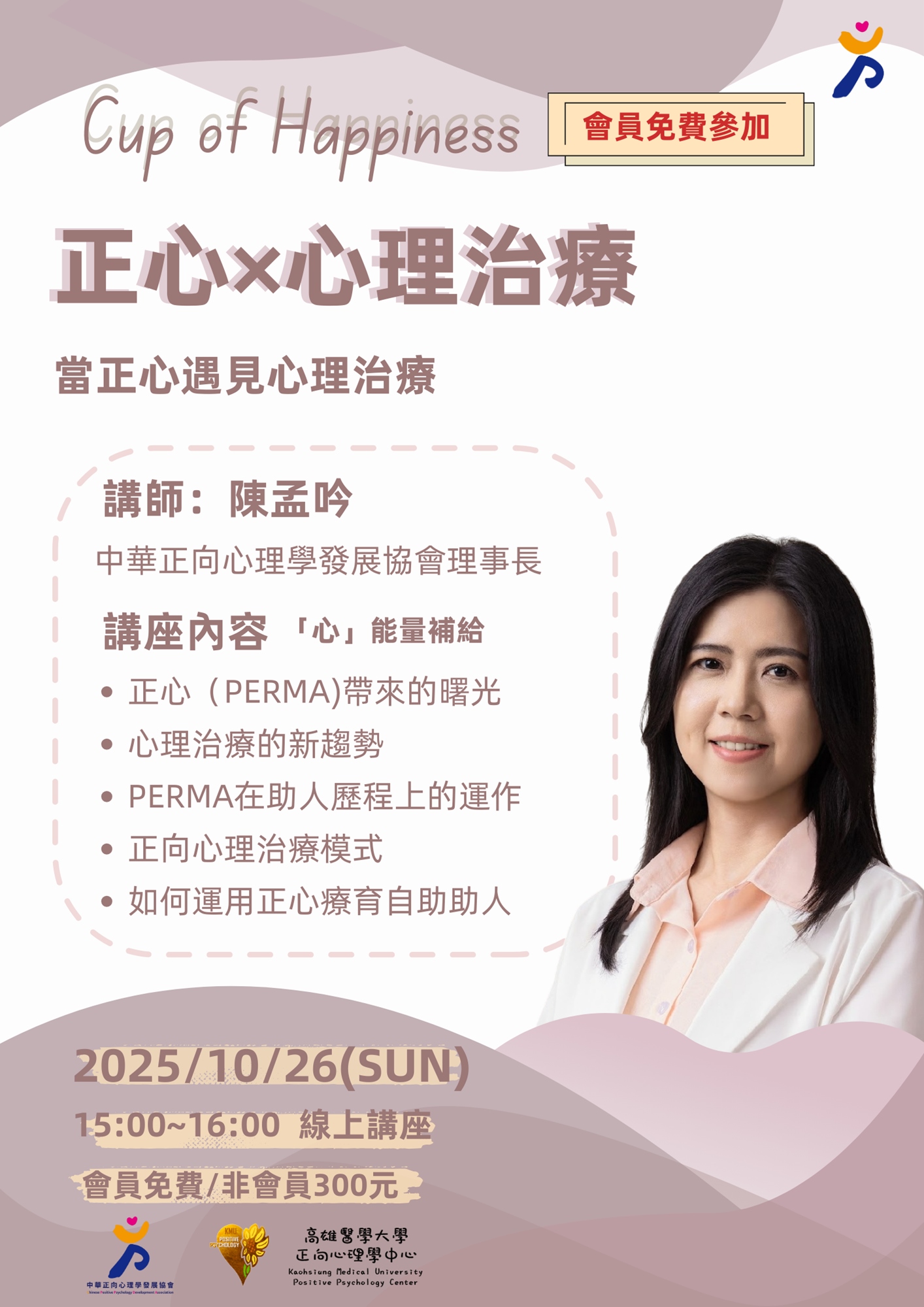 正心下午茶為中華正心協會的會員專屬福利活動~每個月固定一場,講座時長為一個小時!在2025年10月份,我們邀請到陳孟吟講師,以「正心x心理治療」為題,帶我們重新認識政治的溫度與可能。🤩ˊ