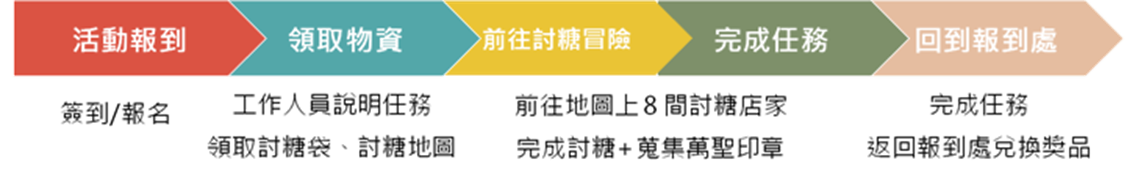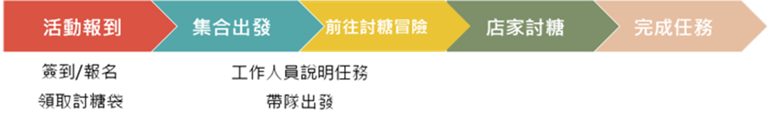 10/26(日) | 第一梯次 13:00-14:00 第二梯次 15:00-16:00 第三梯次 17:00-18:00 | 安排最適當且安全的路線,由工作人員帶隊前往店家討糖。每場次共35名小朋友。 |