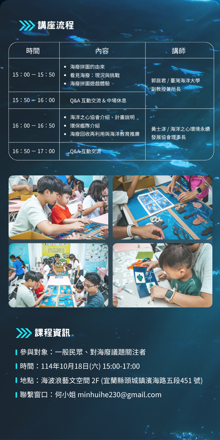 邀請專業講者帶來跨領域分享,從海廢知識、回收再製,到教案設計、漁工關懷,全面強化在地教育與社群力量。