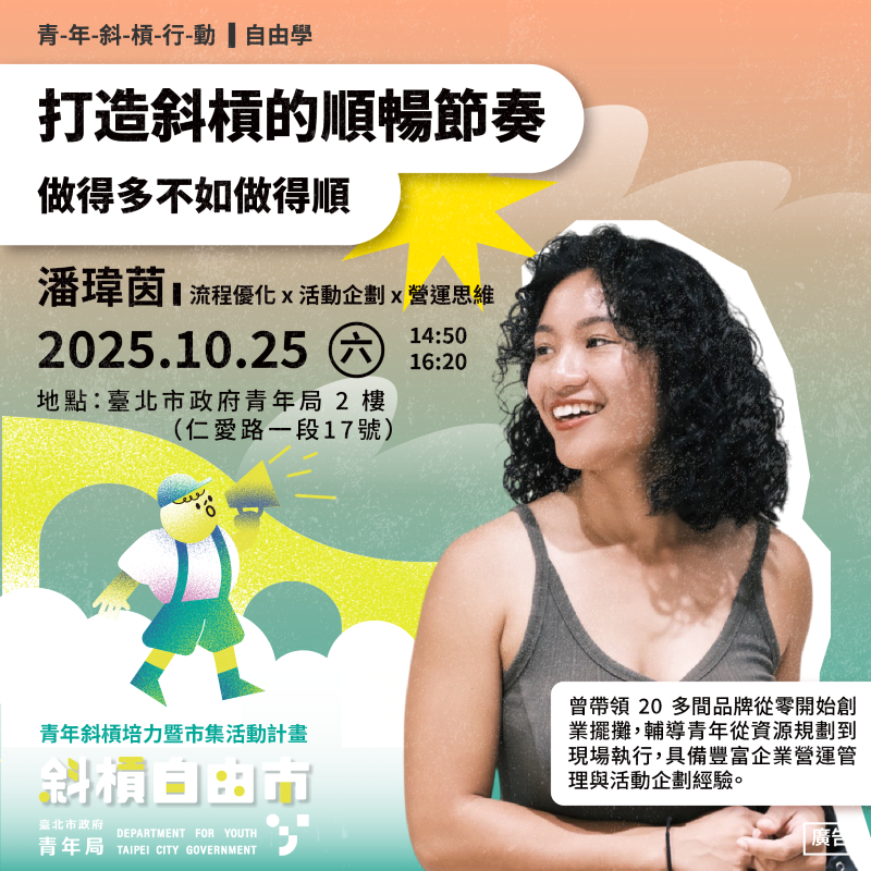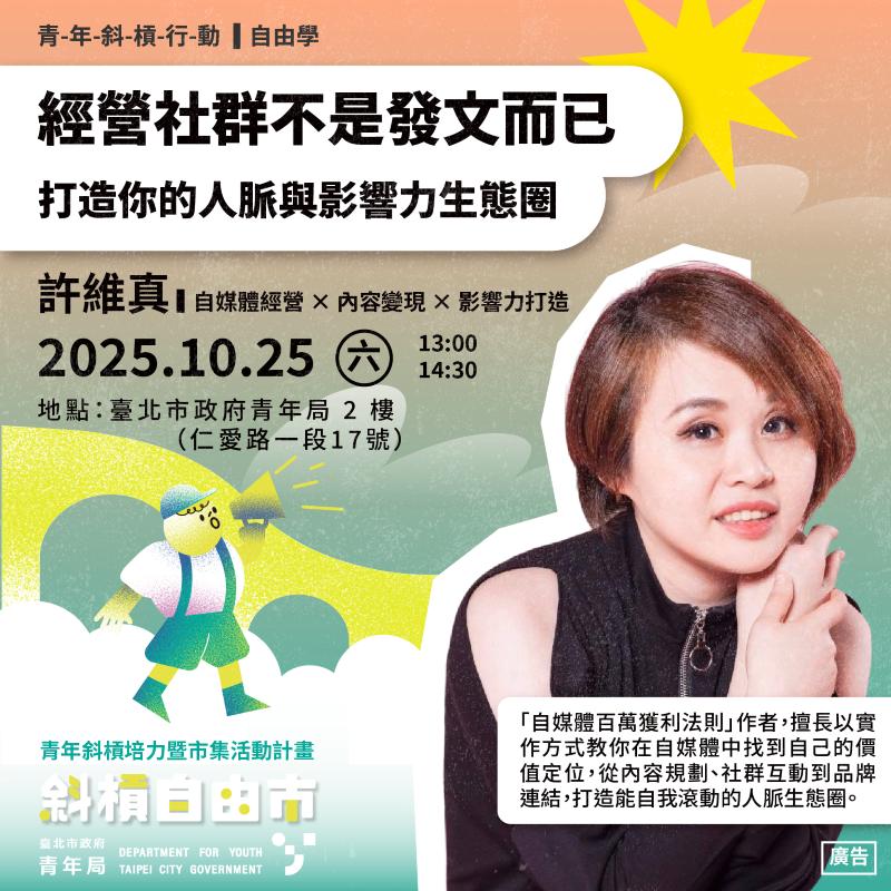 歡迎持續關注「臺北市政府青年局」官網,或上 Facebook / Instagram 搜尋 #斜槓自由市,掌握最新活動消息,一起勇敢斜槓,解鎖你的多重人生