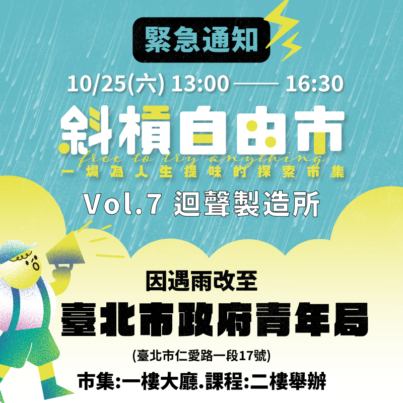 時間 10/25 (六) 13:00-14:30 因氣候變化,課程地點調整至 臺北市政府青年局 1 樓大廳