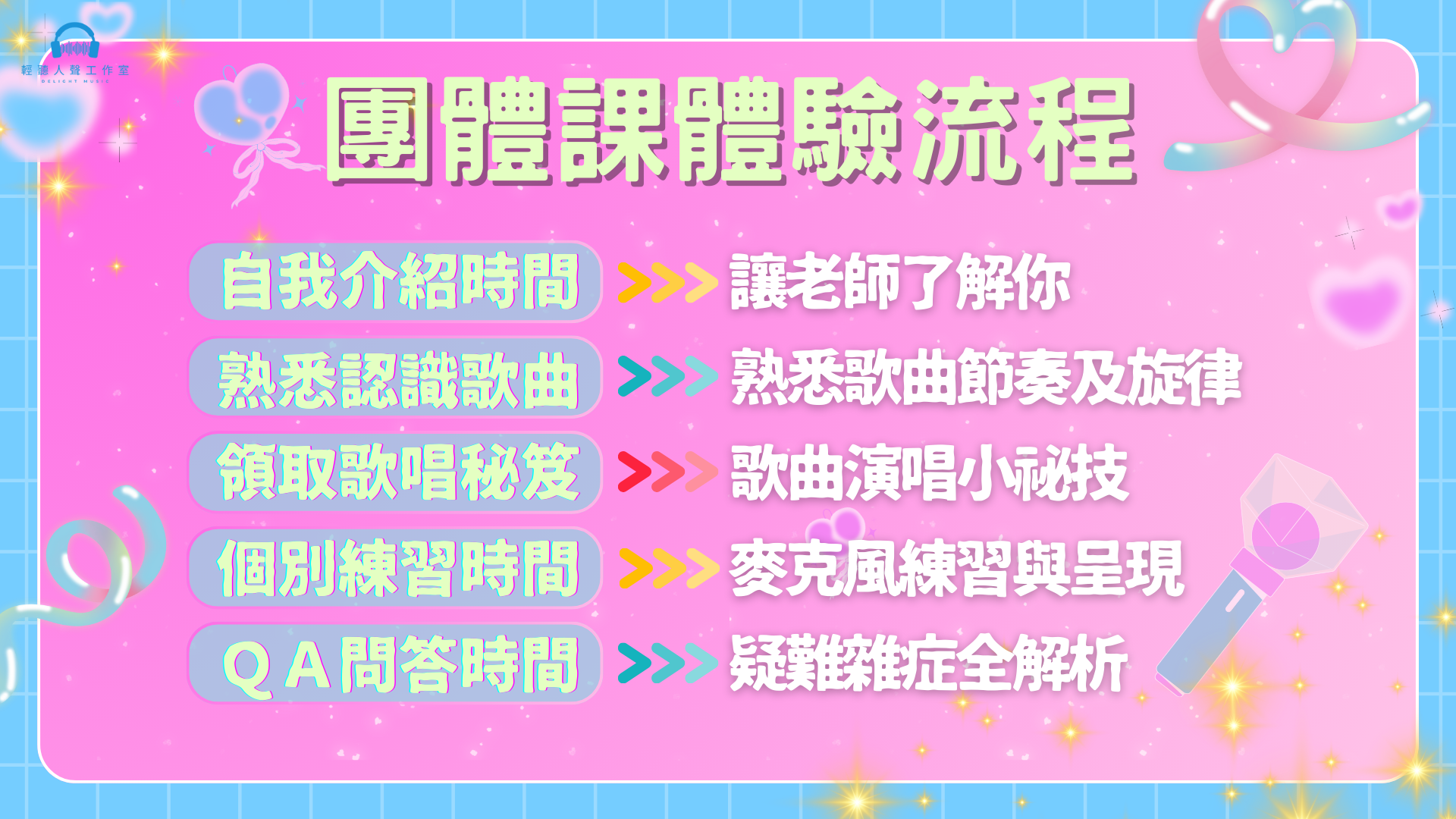 【一曲入魂系列 Pt.1】一日歌唱體驗團班 Kpop獵魔女團 - Golden 【關於課程】 【關於輕聽人聲工作室】 📍地址:台北市士林區重慶北路四段53號2樓 【關於師資】 【更多資訊請加入】LINE@: delightmusic