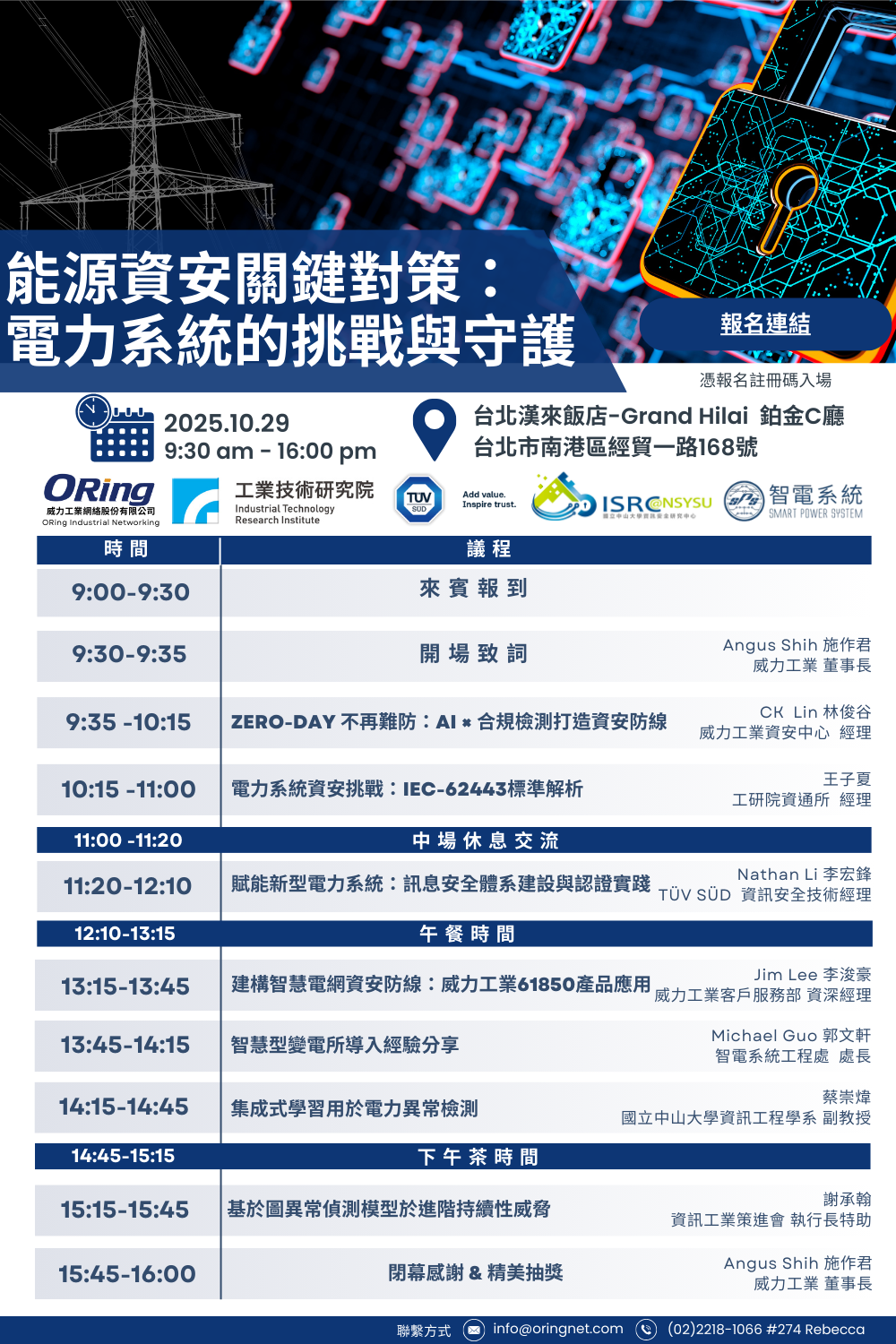 本研討會以「能源資安關鍵對策:電力系統的挑戰與守護」為主題,聚焦電廠與電力產業在資安防護上的實務挑戰與應對策略。活動內容涵蓋國際標準 IEC 62443 的導入經驗、電力資安解決方案解析,以及最新的攻防趨勢分享,協助產業單位強化系統防禦能力與風險應變機制。