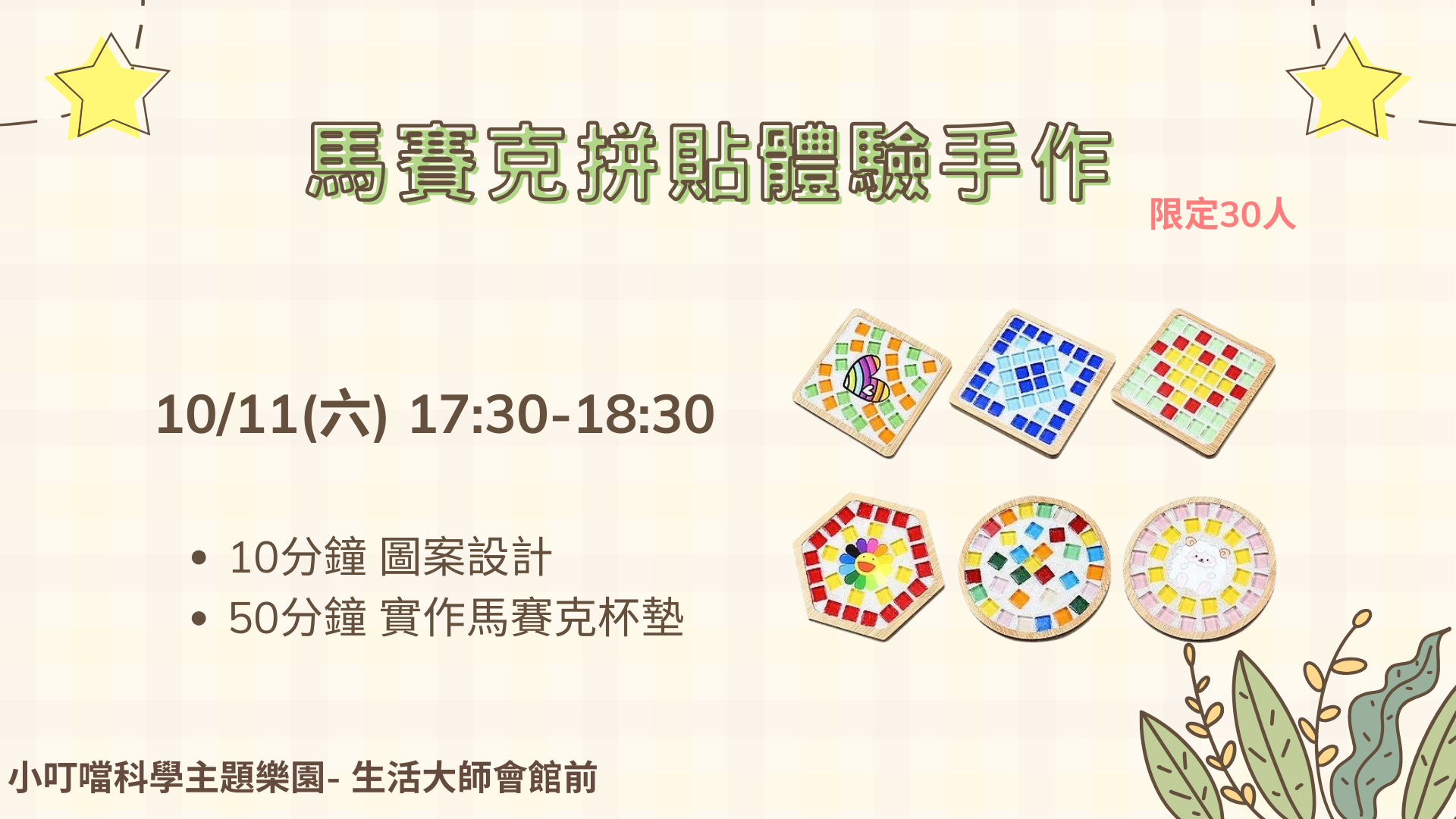 ※馬賽克拼貼杯墊體驗:時段 17:30–18:30