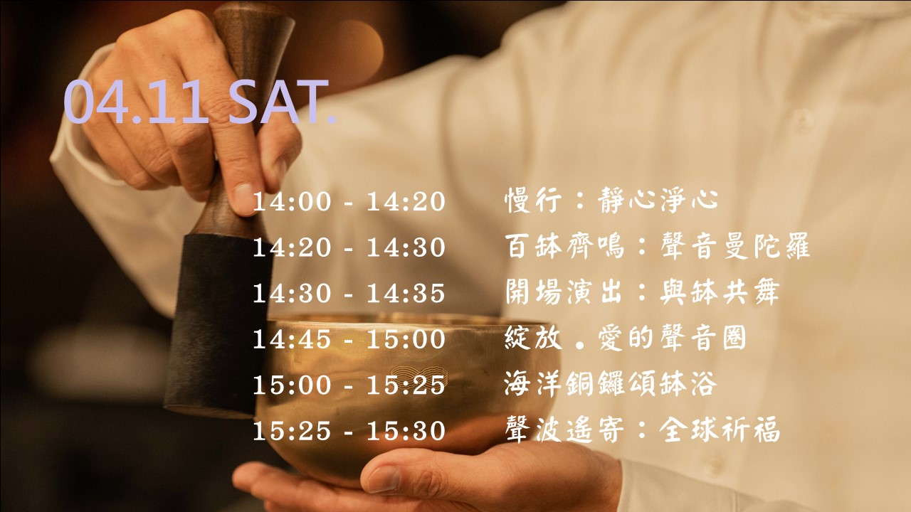 誠摯邀請您,攜帶您的頌缽,與我們共同完成這場「百人頌缽 」的創舉,將充滿愛與和平的力量,透過聲波傳播、綻放出去。