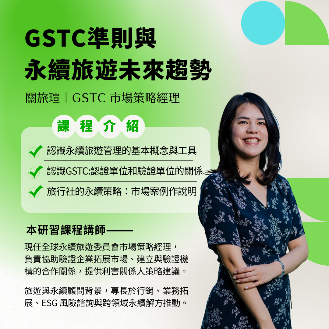 🌍 國際旅遊業者都在談的永續標準,你跟上了嗎? 國際市場已將「永續」視為合作與選擇的重要條件,旅行社在未來市場中保持競爭力,必須從理念到行動全面升級! 本系列活動由交通部觀光署主辦,結合 Day1專業研習課程+Day2標竿企業參訪,帶您認識全球永續旅遊趨勢國際永續準則,解析永續觀光市場,觀摩已獲GTS 綠色旅行標章/GD的目的地。
