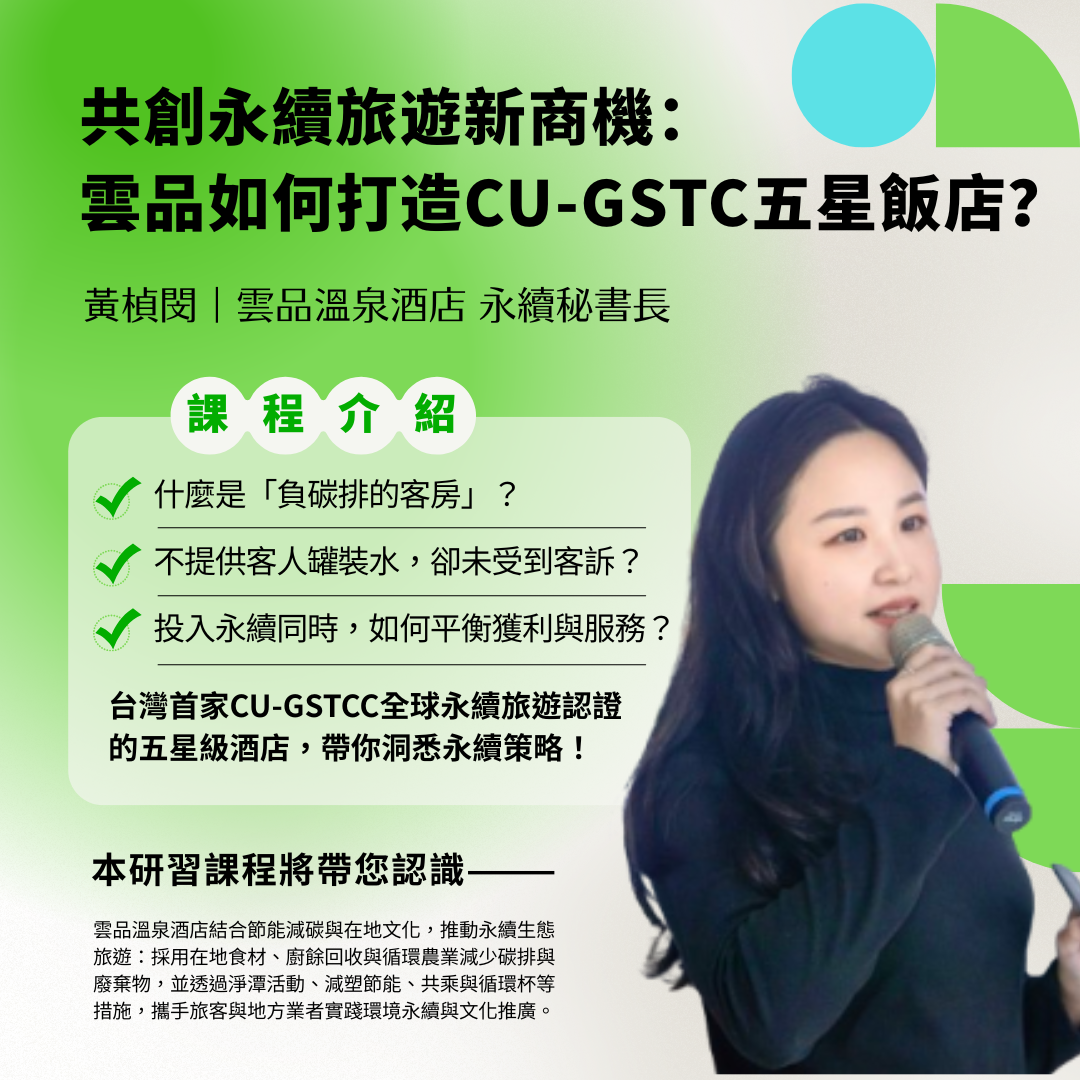 GTS綠色旅行標章申請及經營經驗、馬玉山如何發揮ESG企業社會責任,用行動落實環境保護,也打造永續目的地。從實地案例中體驗操作細節,理解 如何將永續旅遊落實在經營決策與產品設計,確保學習能真正轉化為行動。