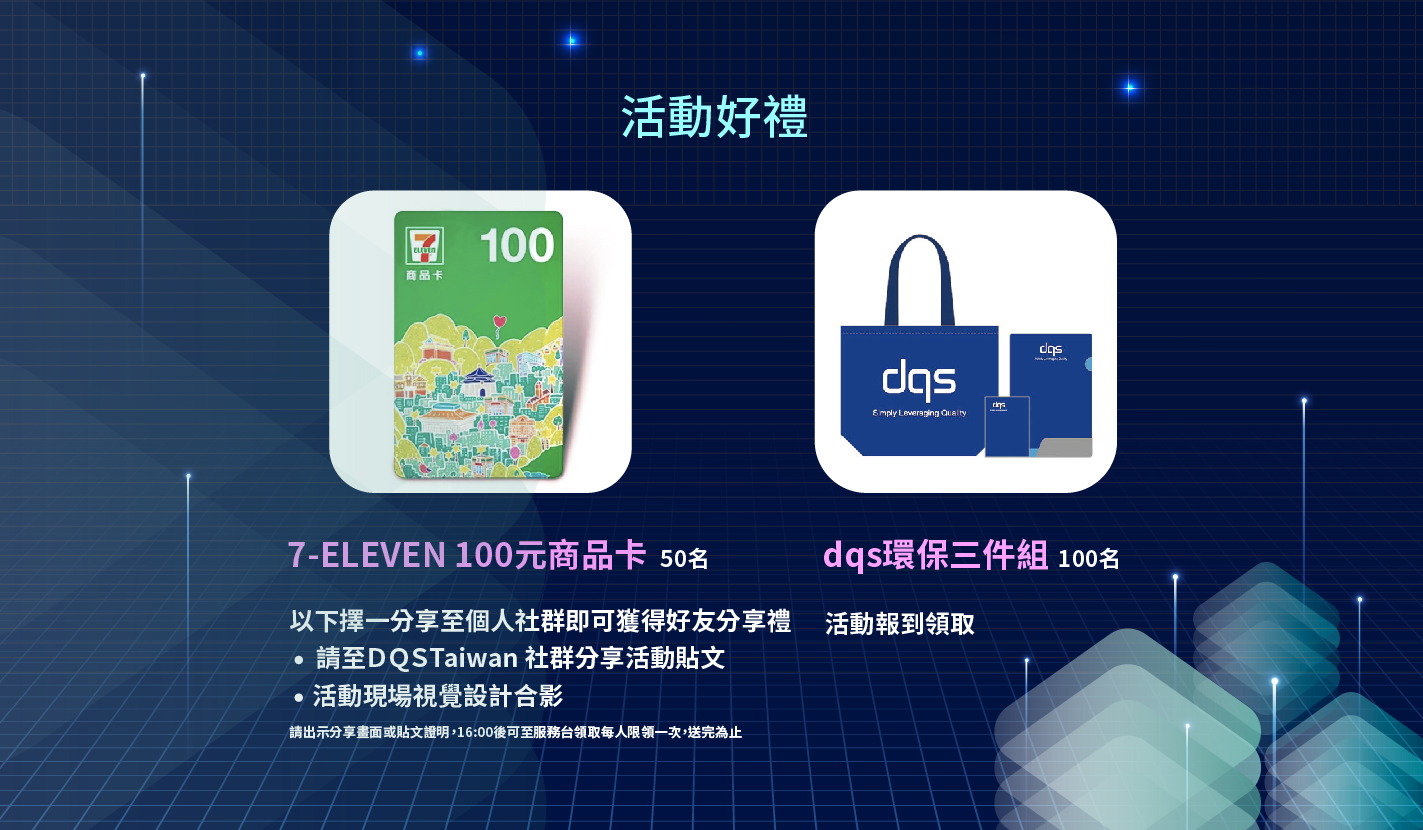 前 50 位分享本活動報名貼文或拍攝現場活動畫面並上傳社群者,即贈 7-11 禮品卡 100 元