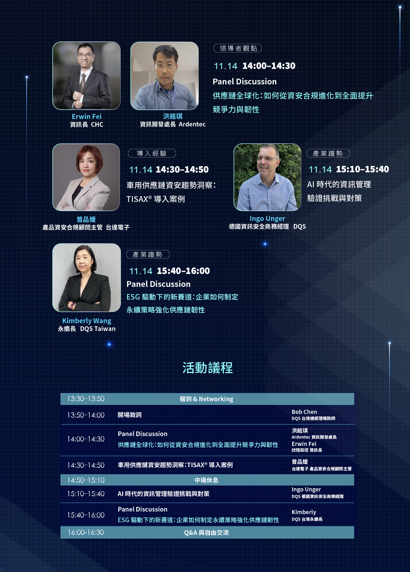 從資安合規文化建立、TISAX® 車載資安驗證的實戰應用導入、ESG 揭露國際法規發展,到 AI 管理系統標準(ISO 42001)的展望與應用,研討會將涵蓋台達電、Ardentec 欣銓、CHC、DQS 德國總部專家等第一線觀點與實戰分享。