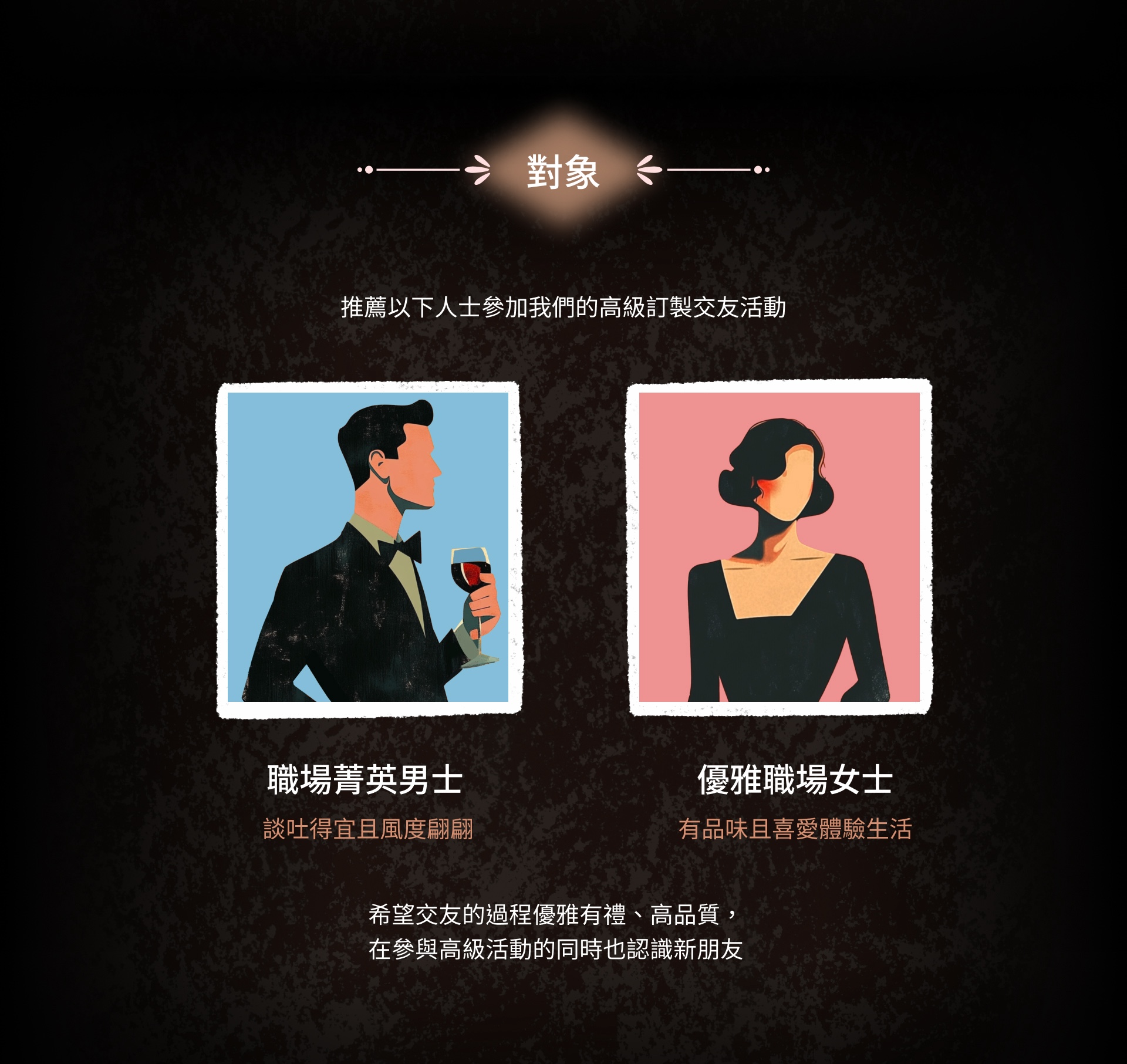 ✔ 希望交友過程優雅有禮、高品質,參與高級活動的同時也認識新朋友