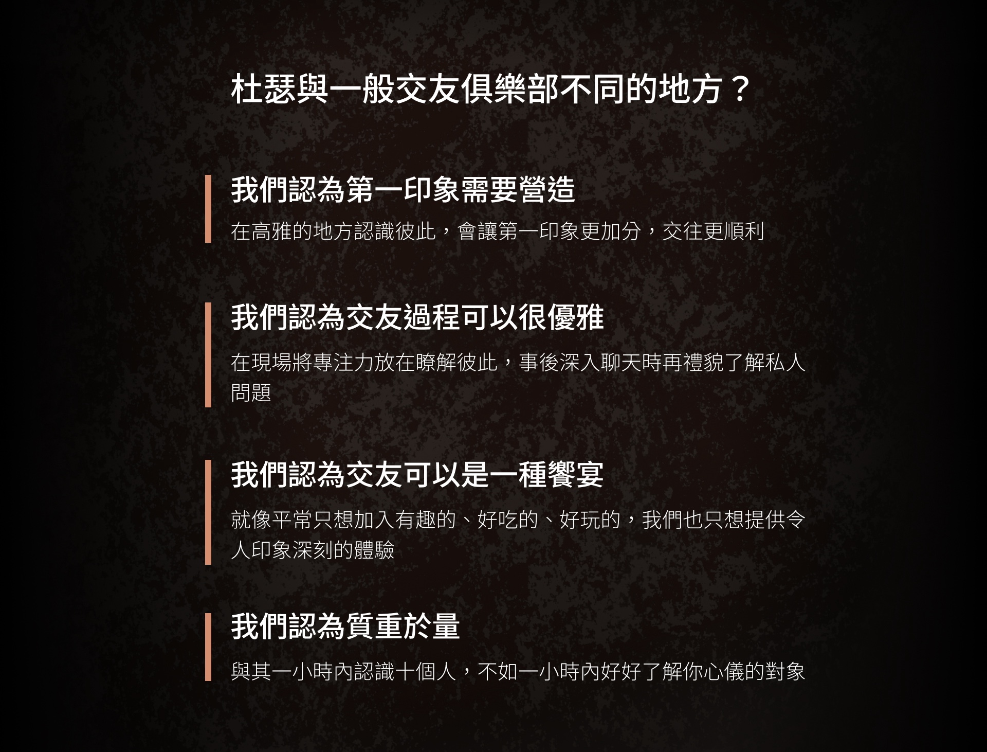 我們認為交友可以是一種饗宴:就像平常只想加入有趣的、好吃的、好玩的,我們也只想提供令人印象深刻的體驗