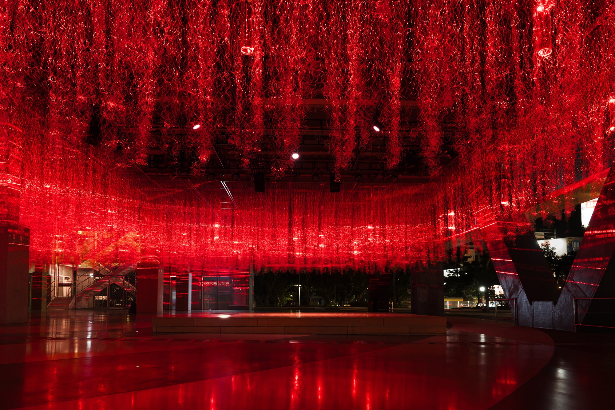 《晚風 Fading Breeze》由藝術家高德亮創作,以尼龍線與水平雷射光介入臺北表演藝術中心一樓開放廣場,將風、氣流與人的移動轉化為光影。工業材料在開放空間中呈現出接近自然的流動,形成時間與空間交織的場域。