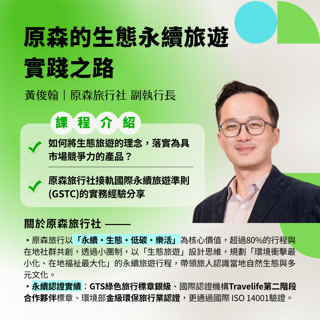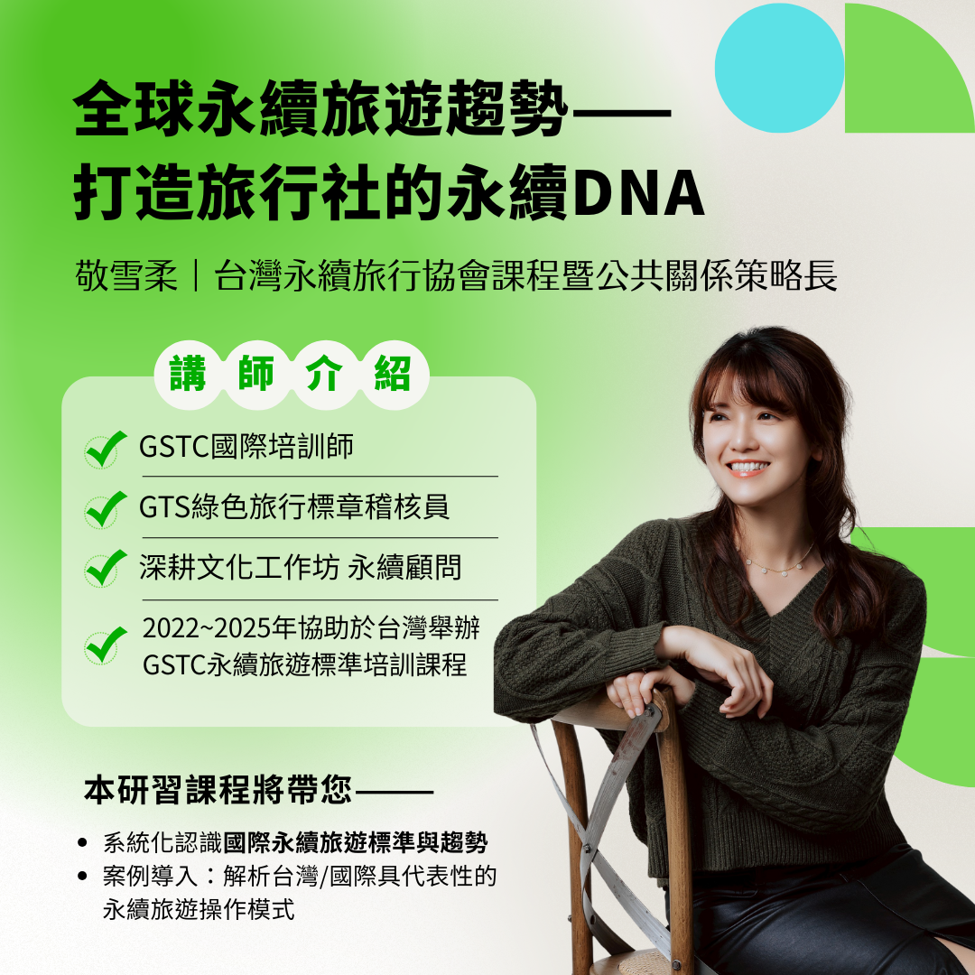 🌍 國際旅遊業者都在談的永續標準,你跟上了嗎? 國際市場已將「永續」視為合作與選擇的重要條件,旅行社在未來市場中保持競爭力,必須從理念到行動全面升級! 本系列活動由交通部觀光署主辦,結合 Day1專業研習課程+Day2標竿企業參訪,帶您認識全球永續旅遊趨勢國際永續準則,解析永續觀光市場,觀摩已獲GTS 綠色旅行標章/GD的目的地。
