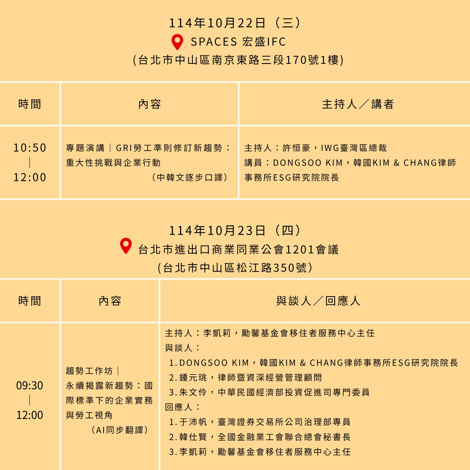 🎤10月22日專題演講:由GRI修訂計畫顧問、韓國獨立專家Dongsoo Kim院長,解析GRI勞工主題修訂最新進度,該準則以「人權」與「盡職調查」為核心,預計於2026年底完成修訂並採用。同時,此次演講邀請IWG臺灣區域總裁許恒豪擔任主持人及對談人,共同從全球企業角度探討永續作為。