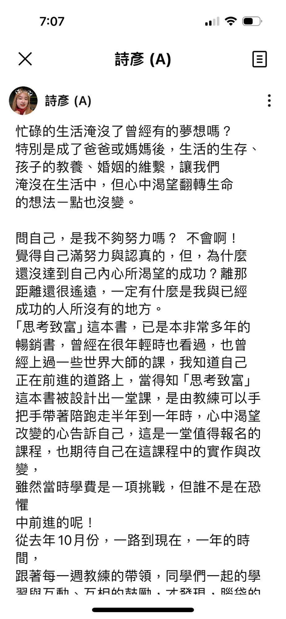 知名補習班創辦人:「今天的教練引導,幫助我改變了困擾我十多年的信念,太棒了!終於可以好好的享受生活了!每一次課程都有意想不到的收穫!」